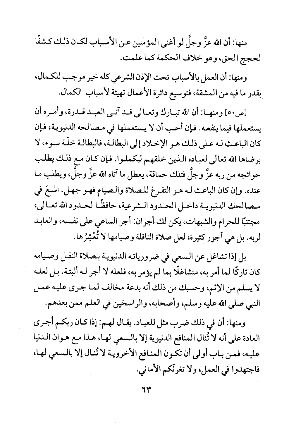 [ص ٥٠] ومنها: أن الله تبارك وتعالى قد آتى العبد قدرة، وأمره أن يستعملها فيما ينفعه. فإن أحب أن لا يستعملها في مصالحه الدنيوية، فإن كان الباعث له على ذلك هو الإخلاد إلى البطالة، فالبطالة خلّة سوء، لا يرضاها الله تعالى لعباده الذين خلقهم ليكملوا. فإن كان مع ذلك يطلب حوائجه من ربه عزَّ وجلَّ فتلك حماقة، يعطل ما آتاه الله عزَّ وجلَّ، ويطلب ما عنده. وإن كان الباعث له هو التفرغ للصلاة والصيام فهو جهل. اسْعَ في مصالحك الدنيوية داخل الحدود الشرعية، حافظًا لحدود الله تعالى، مجتنبًا للحرام والشبهات، يكن لك أجران: أجر الساعي على نفسه، والعابد لربه. بل هي أجور كثيرة، لعل صلاة النافلة وصيامها لا تُعْشِرُها.