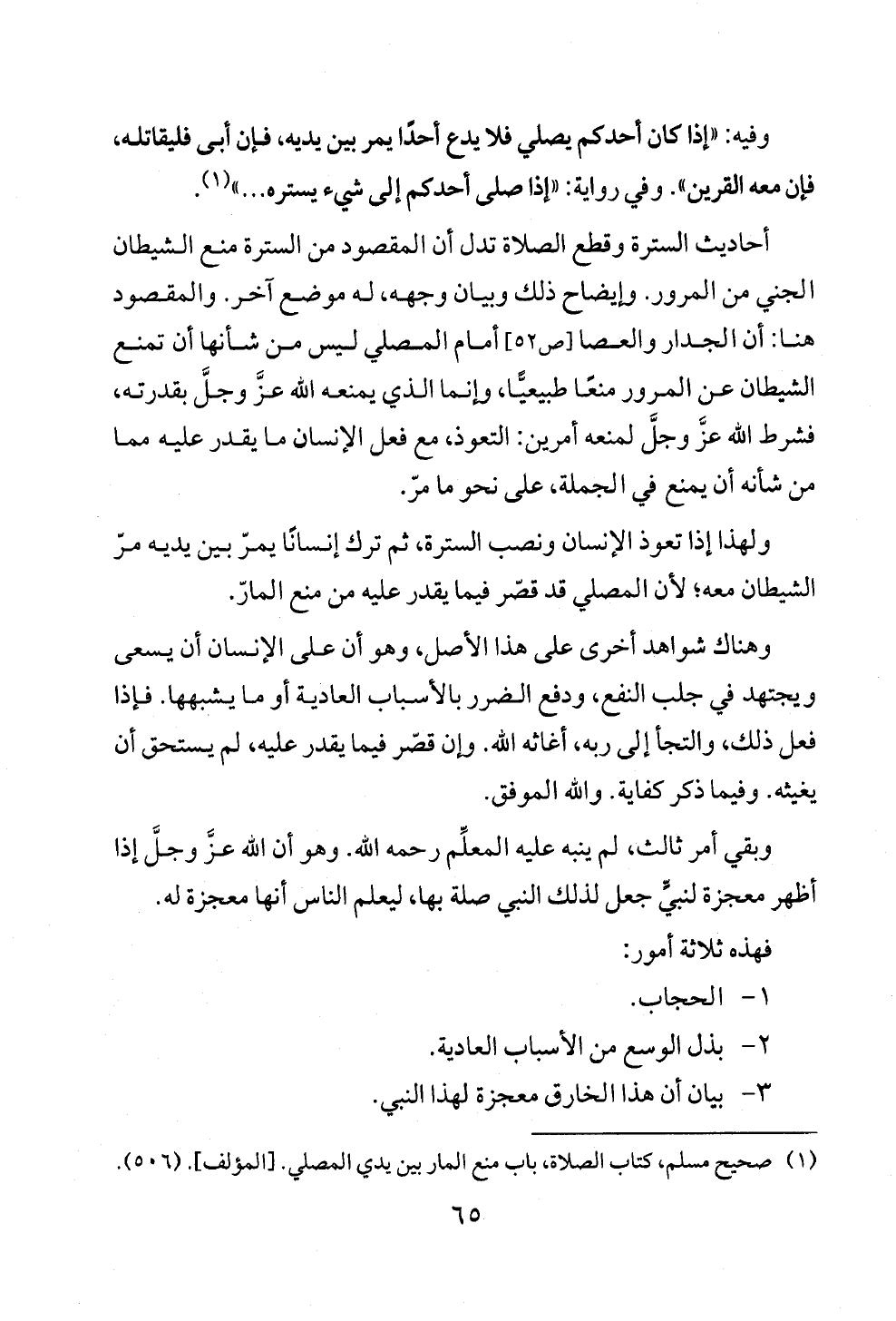 أحاديث السترة وقطع الصلاة تدل أن المقصود من السترة منع الشيطان الجني من المرور. وإيضاح ذلك وبيان وجهه، له موضع آخر. والمقصود هنا: أن الجدار والعصا [ص ٥٢] أمام المصلي ليس من شأنها أن تمنع الشيطان عن المرور منعًا طبيعيًّا، وإنما الذي يمنعه الله عزَّ وجلَّ بقدرته، فشرط الله عزَّ وجلَّ لمنعه أمرين: التعوذ، مع فعل الإنسان ما يقدر عليه مما من شأنه أن يمنع في الجملة، على نحو ما مرّ.