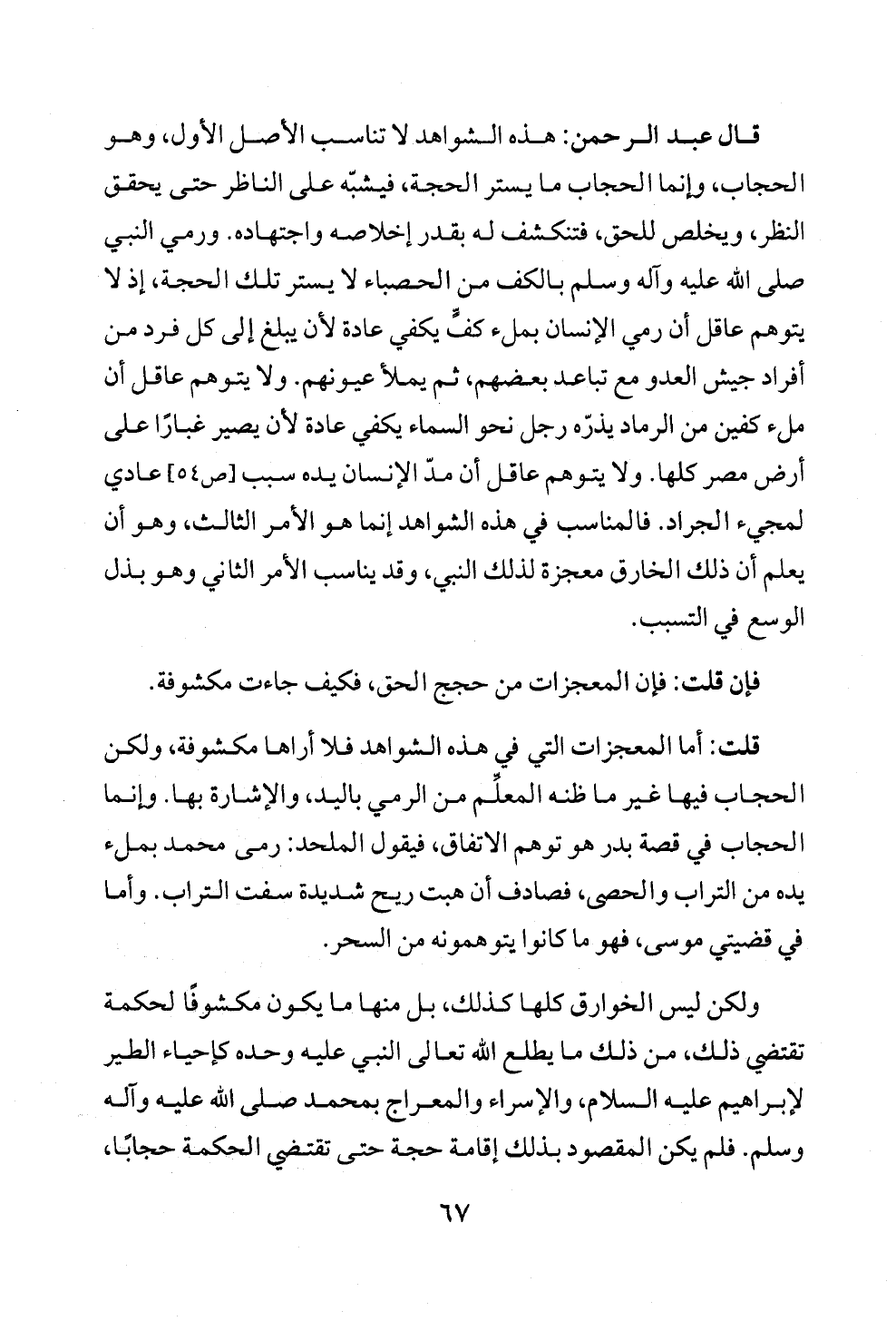 قال عبد الرحمن: هذه الشواهد لا تناسب الأصل الأول، وهو الحجاب، وإنما الحجاب ما يستر الحجة، فيشبّه على الناظر حتى يحقق النظر، ويخلص للحق، فتنكشف له بقدر إخلاصه واجتهاده. ورمي النبي صلى الله عليه وآله وسلم بالكف من الحصباء لا يستر تلك الحجة، إذ لا يتوهم عاقل أن رمي الإنسان بملء كفٍّ يكفي عادة لأن يبلغ إلى كل فرد من أفراد جيش العدو مع تباعد بعضهم، ثم يملأ عيونهم. ولا يتوهم عاقل أن ملء كفين من الرماد يذرّه رجل نحو السماء يكفي عادة لأن يصير غبارًا على أرض مصر كلها. ولا يتوهم عاقل أن مدّ الإنسان يده سبب [ص ٥٤] عادي لمجيء الجراد. فالمناسب في هذه الشواهد إنما هو الأمر الثالث، وهو أن يعلم أن ذلك الخارق معجزة لذلك النبي، وقد يناسب الأمر الثاني وهو بذل الوسع في التسبب.