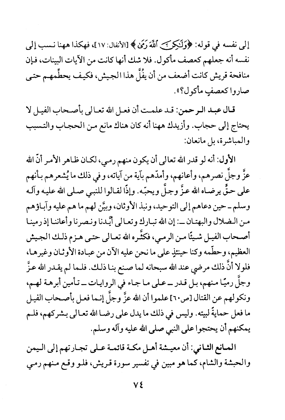 قال عبد الرحمن: قد علمت أن فعل الله تعالى بأصحاب الفيل لا يحتاج إلى حجاب. وأزيدك ههنا أنه كان هناك مانع من الحجاب والتسبب والمباشرة، بل مانعان: