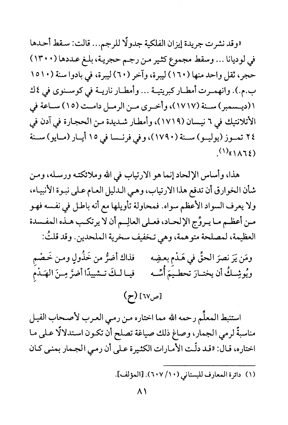 "وقد نشرت جريدة إيزان الفلكية جدولًا للرجم ... قالت: سقط أحدها في لوديانا ... وسقط مجموع كثير من رجم حجرية، بلغ عددها (١٣٠٠) حجر، ثقل واحد منها (١٦٠) ليبرة، وآخر (٦٠) ليبرة، في بادوا سنة (١٥١٠ ب. م.). وانهمرت أمطار كبريتية ... وأمطار نارية في كوسنوى في ٤ ك ١ (ديسمبر) سنة (١٧١٧)، وأخرى من الرمل دامت (١٥) ساعة في الأتلانتيك في ٦ نيسان (١٧١٩)، وأمطار شديدة من الحجارة في آدن في ٢٤ تموز (يوليو) سنة (١٧٩٠)، وفي فرنسا في ١٥ أيار (مايو) سنة (١٨٦٤" (¬١).