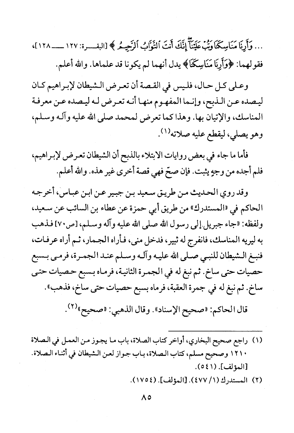 وعلى كل حال، فليس في القصة أن تعرض الشيطان لإبراهيم كان ليصده عن الذبح، وإنما المفهوم منها أنه تعرض له ليصده عن معرفة المناسك، والإتيان بها. وهذا كما تعرض لمحمد صلى الله عليه وآله وسلم، وهو يصلي، ليقطع عليه صلاته (¬١).