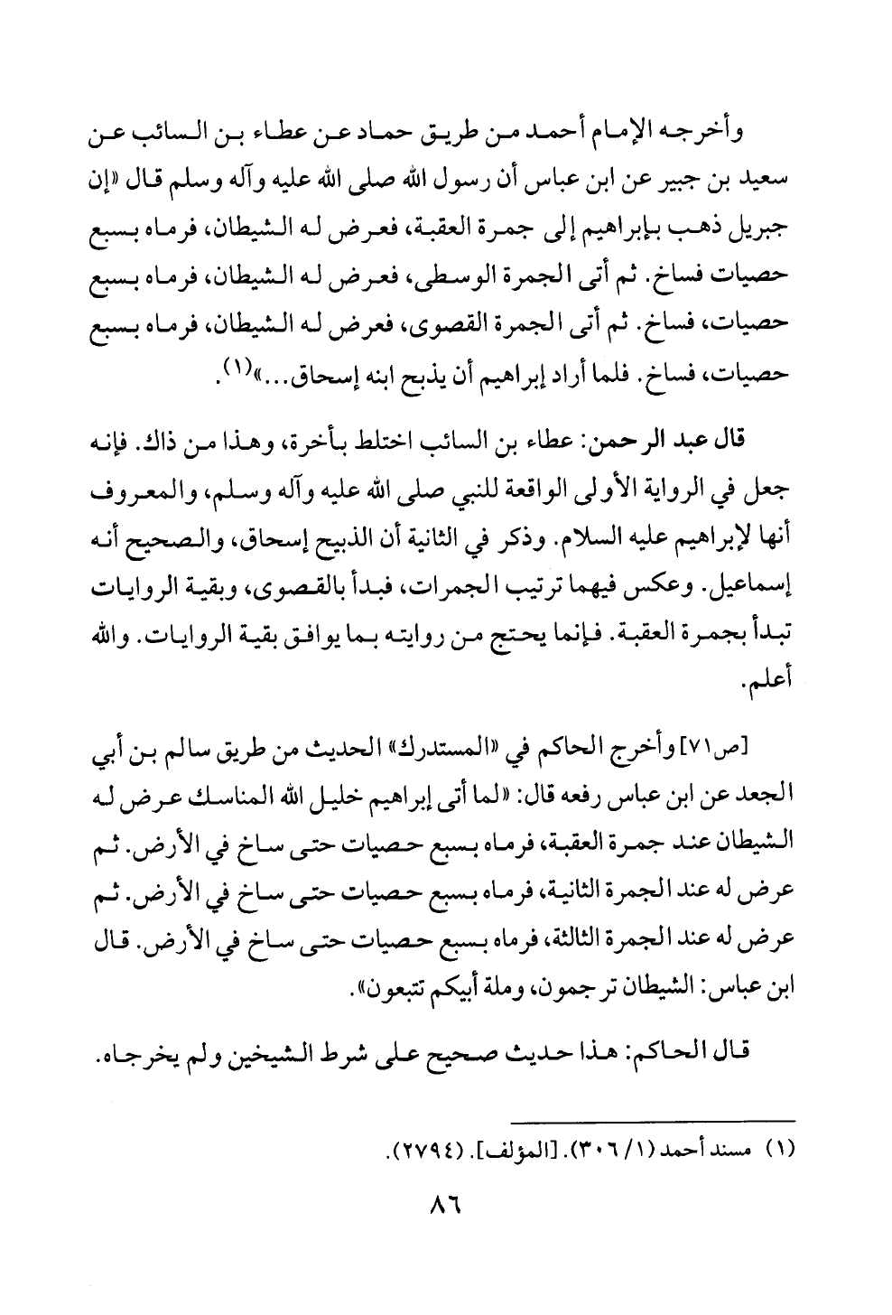 وأخرجه الإمام أحمد من طريق حماد عن عطاء بن السائب عن سعيد بن جبير عن ابن عباس أن رسول الله صلى الله عليه وآله وسلم قال "إن جبريل ذهب بإبراهيم إلى جمرة العقبة، فعرض له الشيطان، فرماه بسبع حصيات فساخ. ثم أتى الجمرة الوسطى، فعرض له الشيطان، فرماه بسبع حصيات، فساخ. ثم أتى الجمرة القصوى، فعرض له الشيطان، فرماه بسبع حصيات، فساخ. فلما أراد إبراهيم أن يذبح ابنه إسحاق ... " (¬١).