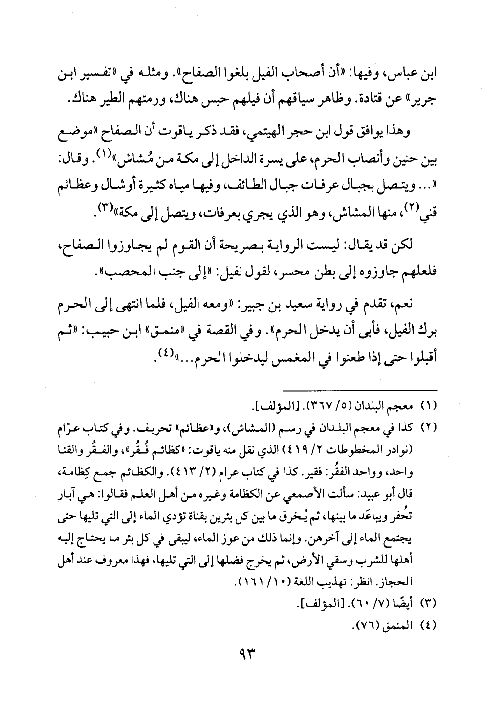وهذا يوافق قول ابن حجر الهيتمي، فقد ذكر ياقوت أن الصفاح "موضع بين حنين وأنصاب الحرم، على يسرة الداخل إلى مكة من مُشاش" (¬١). وقال: " ... ويتصل بجبال عرفات جبال الطائف، وفيها مياه كثيرة أوشال وعظائم قني (¬٢)، منها المشاش، وهو الذي يجري بعرفات، ويتصل إلى مكة" (¬٣).