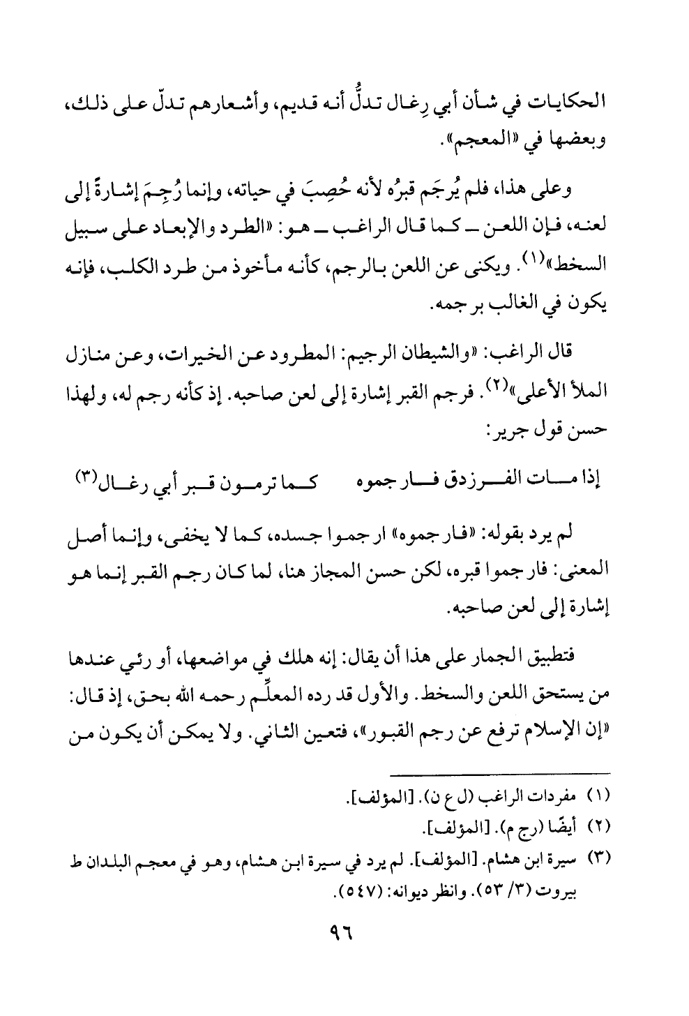 وعلى هذا، فلم يُرجَم قبرُه لأنه حُصِبَ في حياته، وإنما رُجِمَ إشارةً إلى لعنه، فإن اللعن ــ كما قال الراغب ــ هو: "الطرد والإبعاد على سبيل السخط" (¬١). ويكنى عن اللعن بالرجم، كأنه مأخوذ من طرد الكلب، فإنه يكون في الغالب برجمه.
