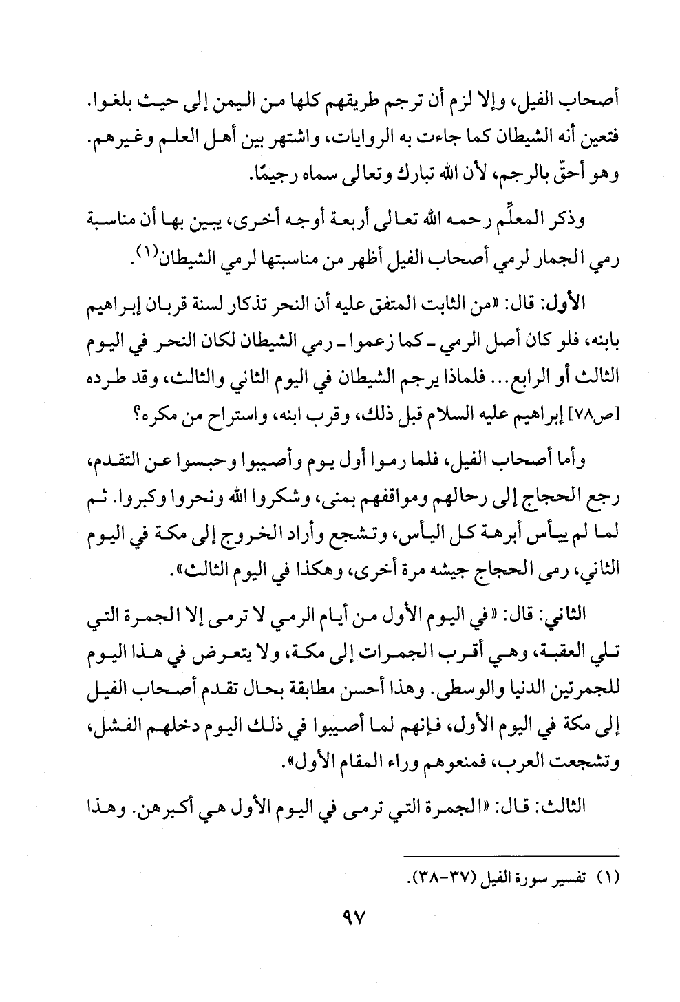 الثاني: قال: "في اليوم الأول من أيام الرمي لا ترمى إلا الجمرة التي تلي العقبة، وهي أقرب الجمرات إلى مكة، ولا يتعرض في هذا اليوم للجمرتين الدنيا والوسطى. وهذا أحسن مطابقة بحال تقدم أصحاب الفيل إلى مكة في اليوم الأول، فإنهم لما أصيبوا في ذلك اليوم دخلهم الفشل، وتشجعت العرب، فمنعوهم وراء المقام الأول".