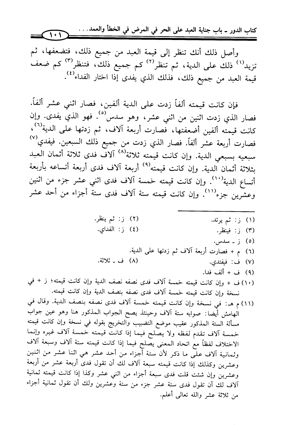 (¬11) م هـ: في نسخة وإن كانت قيمته خمسة آلاف فدى نصفه بنصف الدية. وقال في الهامش أيضاً: صوابه ستة آلاف وحينئذ يصح الجواب المذكور هنا وهو عين جواب مسألة الستة المذكور عقيب موضوع التضبيب والتخريج بقوله في نسخة وإن كانت قيمته خمسة آلاف تقدم لفظه ولا يصلح فيما إذا كانت قيمته خمسة آلاف غيره وإنما الاختلاف لفظاً مع اتحاد المعنى يصلح فيما إذا كانت قيمته ستة آلاف وسبعة آلاف وثمانية آلاف على ما ذكر لأن ستة أجزاء من أحد عشر هي اثنا عشر من اثنين وعشرين وكذلك إذا كانت قيمته سبعة آلاف لك أن تقول فدى أربعة عشر من أربعة وعشرين وإن شئت قلت فدى سبعة أجزاء من اثني عشر وكذا إذا كانت قيمته ثمانية آلاف لك أن تقول فدى ستة عشر جزء من ستة وعشرين ولك أن تقول ثمانية أجزاء من ثلاثة عشر والله تعالى أعلم.