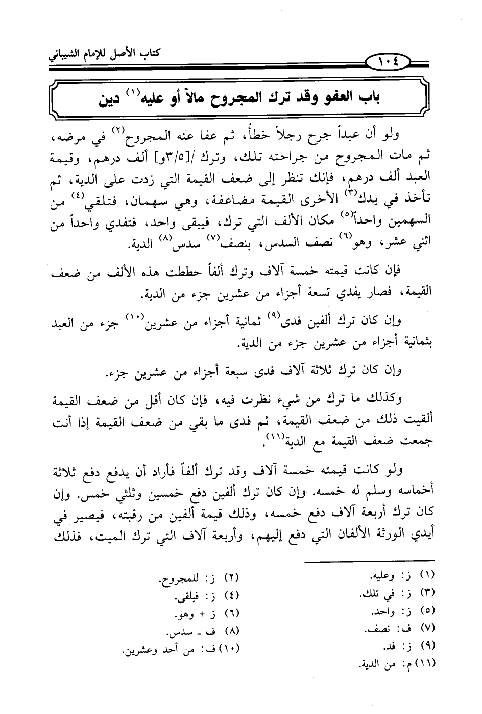 ولو أن عبداً جرح رجلاً خطأً، ثم عفا عنه المجروح (¬2) في مرضه، ثم مات المجروح من جراحته تلك، وترك ألف درهم، وقيمة العبد ألف درهم، فإنك تنظر إلى ضعف القيمة التي زدت على الدية، ثم تأخذ في يدك (¬3) الأخرى القيمة مضاعفة، وهي سهمان، فتلقي (¬4) من السهمين واحداً (¬5) مكان الألف التي ترك، فيبقى واحد، فتفدي واحداً من اثني عشر، وهو (¬6) نصف السدس، بنصف (¬7) سدس (¬8) الدية.