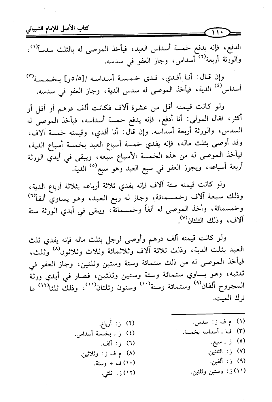 ولو كانت قيمته أقل من عشرة آلاف فكانت ألف درهم أو أقل أو أكثر، فقال المولى: أنا أدفع، فإنه يدفع خمسة أسداسه، فيأخذ الموصى له السدس، والورثة أربعة أسداسه. وإن قال: أنا أفدي، وقيمته خمسة آلاف، وقد أوصى بثلث ماله، فإنه يفدي خمسة أسباع العبد بخمسة أسباع الدية، فيأخذ الموصى له من هذه الخمسة الأسباع سبعه، ويبقى في أيدي الورثة أربعة أسباعه، ويجوز العفو في سبع العبد وهو سبع (¬5) الدية.
