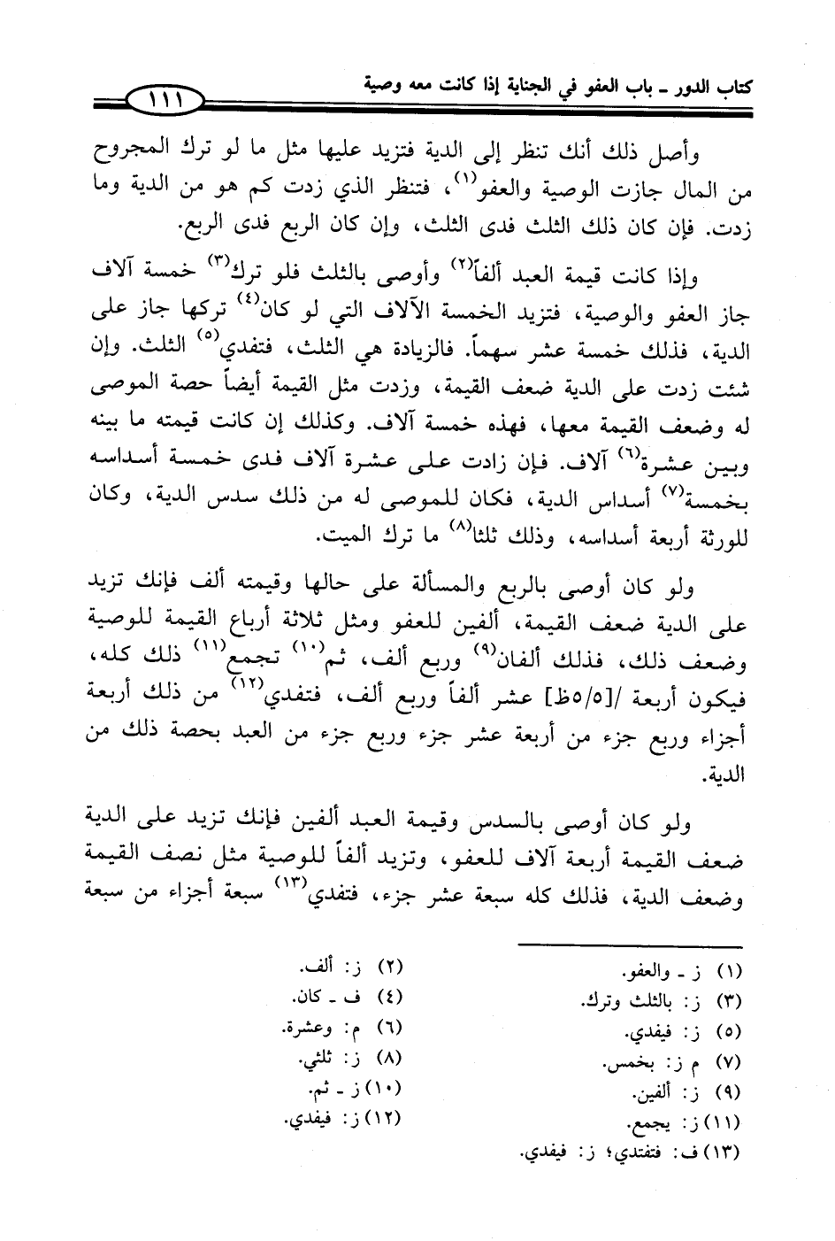 وإذا كانت قيمة العبد ألفاً (¬2) وأوصى بالثلث فلو ترك (¬3) خمسة آلاف جاز العفو والوصية، فتزيد الخمسة الآلاف التي لو كان (¬4) تركها جاز على الدية، فذلك خمسة عشر سهماً. فالزيادة هي الثلث، فتفدي (¬5) الثلث. وإن شئت زدت على الدية ضعف القيمة، وزدت مثل القيمة أيضاً حصة الموصى له وضعف القيمة معها، فهذه خمسة آلاف. وكذلك إن كانت قيمته ما بينه وبين عشرة (¬6) آلاف. فإن زادت على عشرة آلاف فدى خمسة أسداسه بخمسة (¬7) أسداس الدية، فكان للموصى له من ذلك سدس الدية، وكان للورثة أربعة أسداسه، وذلك ثلثا (¬8) ما ترك الميت.