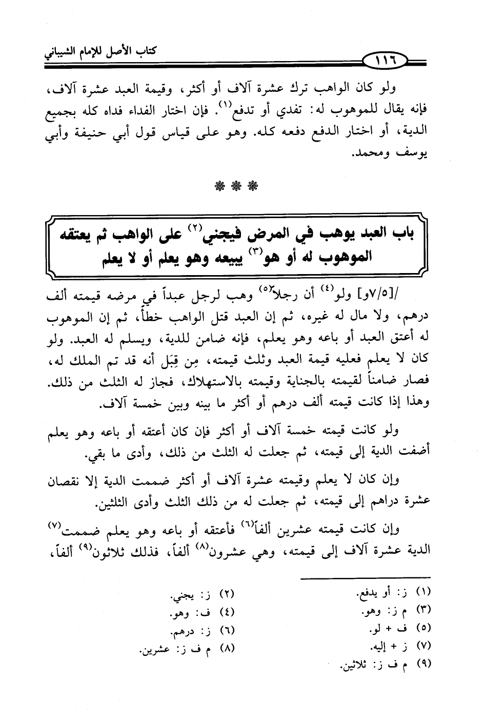 ولو (¬4) أن رجلاً (¬5) وهب لرجل عبداً فيِ مرضه قيمته ألف درهم، ولا مال له غيره، ثم إن العبد قتل الواهب خطأً، ثم إن الموهوب له أعتق العبد أو باعه وهو يعلم، فإنه ضامن للدية، ويسلم له العبد. ولو كان لا يعلم فعليه قيمة العبد وثلث قيمته، مِن قِبَل أنه قد تم الملك له، فصار ضامناً لقيمته بالجناية وقيمته بالاستهلاك، فجاز له الثلث من ذلك. وهذا إذا كانت قيمته ألف درهم أو أكثر ما بينه وبين خمسة آلاف.