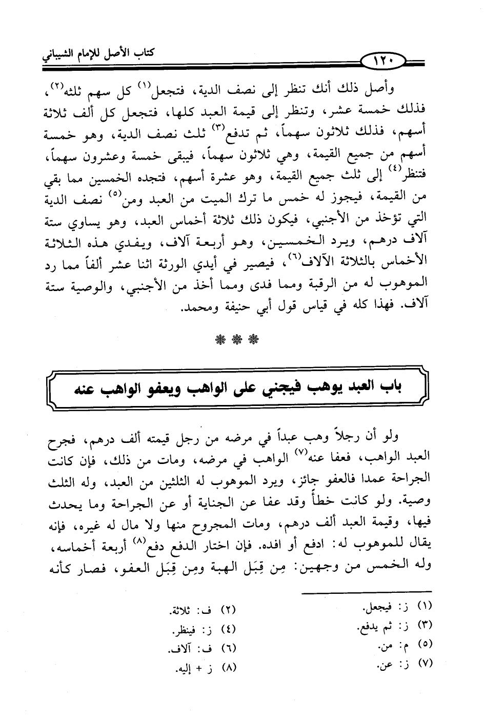 وأصل ذلك أنك تنظر إلى نصف الدية، فتجعل (¬1) كل سهم ثلثه (¬2)، فذلك خمسة عشر، وتنظر إلى قيمة العبد كلها، فتجعل كل ألف ثلاثة أسهم، فذلك ثلاثون سهماً، ثم تدفع (¬3) ثلث نصف الدية، وهو خمسة أسهم من جميع القيمة، وهي ثلاثون سهماً، فيبقى خمسة وعشرون سهماً، فتنظر (¬4) إلى ثلث جميع القيمة، وهو عشرة أسهم، فتجده الخمسين مما بقي من القيمة، فيجوز له خمس ما ترك الميت من العبد ومن (¬5) نصف الدية التي تؤخذ من الأجنبي، فيكون ذلك ثلاثة أخماس العبد، وهو يساوي ستة آلاف درهم، ويرد الخمسين، وهو أربعة آلاف، ويفدي هذه الثلاثة الأخماس بالثلاثة الآلاف (¬6)، فيصير في أيدي الورثة اثنا عشر ألفاً مما رد الموهوب له من الرقبة ومما فدى ومما أخذ من الأجنبي، والوصية ستة آلاف. فهذا كله في قياس قول أبي حنيفة ومحمد.