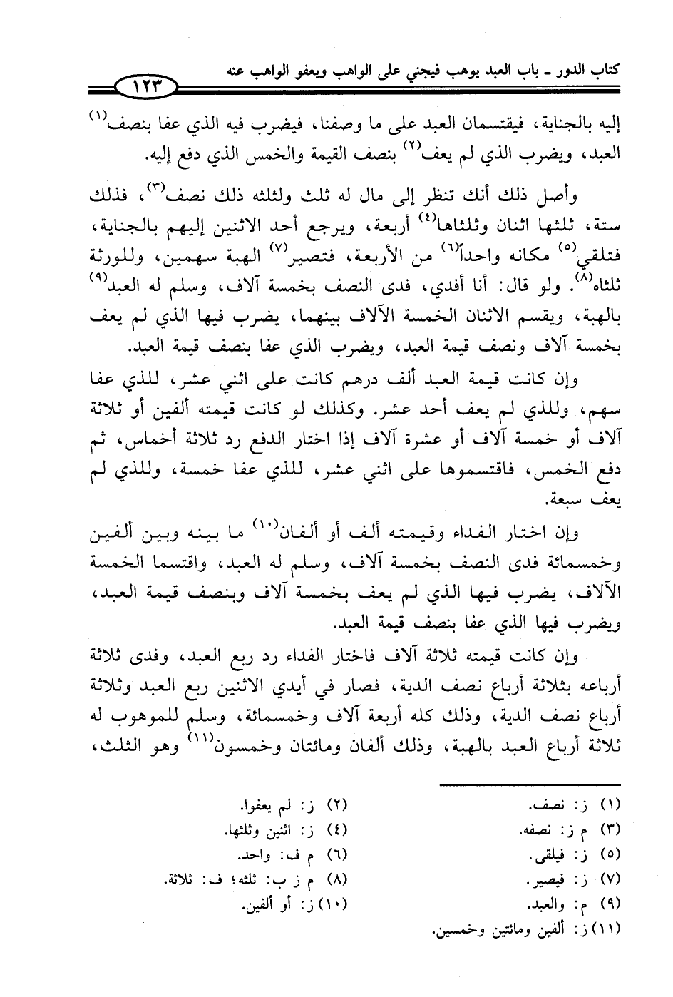 وأصل ذلك أنك تنظر إلى مال له ثلث ولثلثه ذلك نصف (¬3)، فذلك ستة، ثلثها اثنان وثلثاها (¬4) أربعة، ويرجع أحد الاثنين إليهم بالجناية، فتلقي (¬5) مكانه واحداً (¬6) من الأربعة، فتصير (¬7) الهبة سهمين، وللورثة ثلثاه (¬8). ولو قال: أنا أفدي، فدى النصف بخمسة آلاف، وسلم له العبد (¬9) بالهبة، ويقسم الاثنان الخمسة الآلاف بينهما، يضرب فيها الذي لم يعف بخمسة آلاف ونصف قيمة العبد، ويضرب الذي عفا بنصف قيمة العبد.
