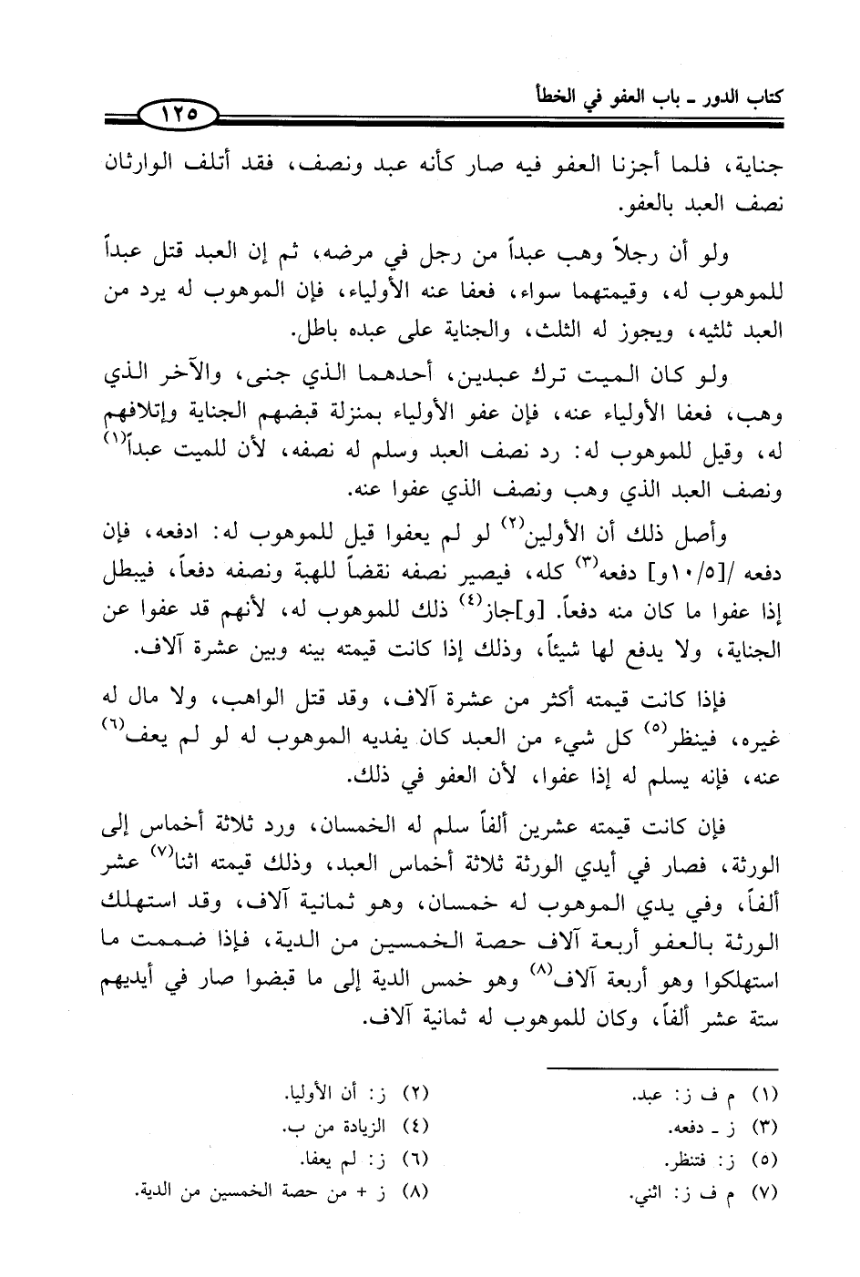 وأصل ذلك أن الأولين (¬2) لو لم يعفوا قيل للموهوب له: ادفعه، فإن دفعه دفعه (¬3) كله، فيصير نصفه نقضًا للهبة ونصفه دفعًا، فيبطل إذا عفوا ما كان منه دفعاً. [و] جاز (¬4) ذلك للموهوب له، لأنهم قد عفوا عن الجناية، ولا يدفع لها شيئاً، وذلك إذا كانت قيمته بينه وبين عشرة آلاف.