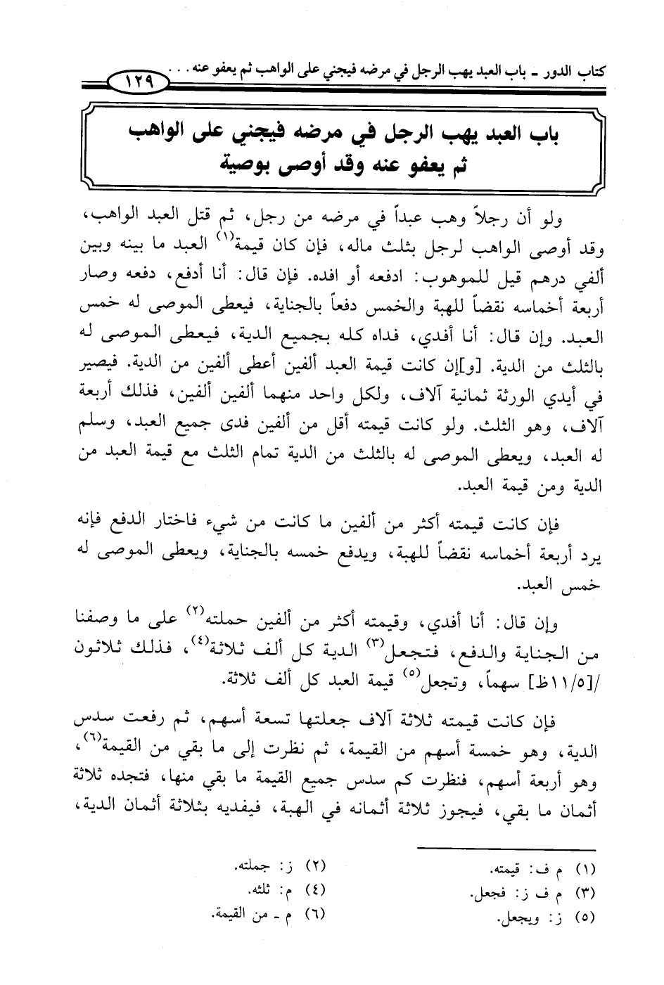 فإن كانت قيمته ثلاثة آلاف جعلتها تسعة أسهم، ثم رفعت سدس الدية، وهو خمسة أسهم من القيمة، ثم نظرت إلى ما بقي من القيمة (¬6)، وهو أربعة أسهم، فنظرت كم سدس جميع القيمة ما بقي منها، فتجده ثلاثة أثمان ما بقي، فيجوز ثلاثة أثمانه في الهبة، فيفديه بثلاثة أثمان الدية،