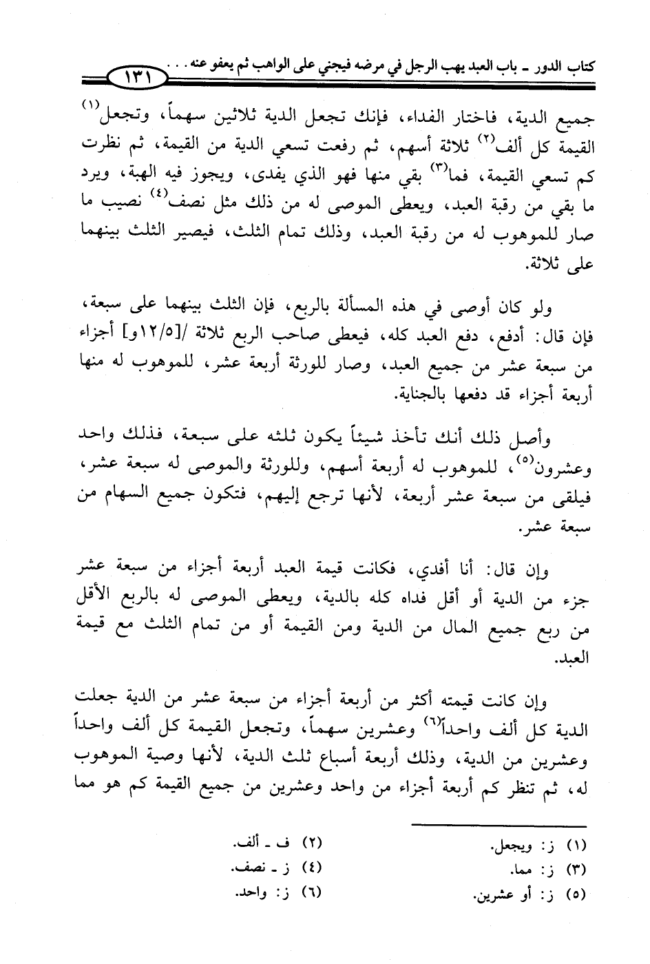 جميع الدية، فاختار الفداء، فإنك تجعل الدية ثلاثين سهماً، وتجعل (¬1) القيمة كل ألف (¬2) ثلاثة أسهم، ثم رفعت تسعي الدية من القيمة، ثم نظرت كم تسعي القيمة، فما (¬3) بقي منها فهو الذي يفدى، ويجوز فيه الهبة، ويرد ما بقي من رقبة العبد، ويعطى الموصى له من ذلك مثل نصف (¬4) نصيب ما صار للموهوب له من رقبة العبد، وذلك تمام الثلث، فيصير الثلث بينهما على ثلاثة.