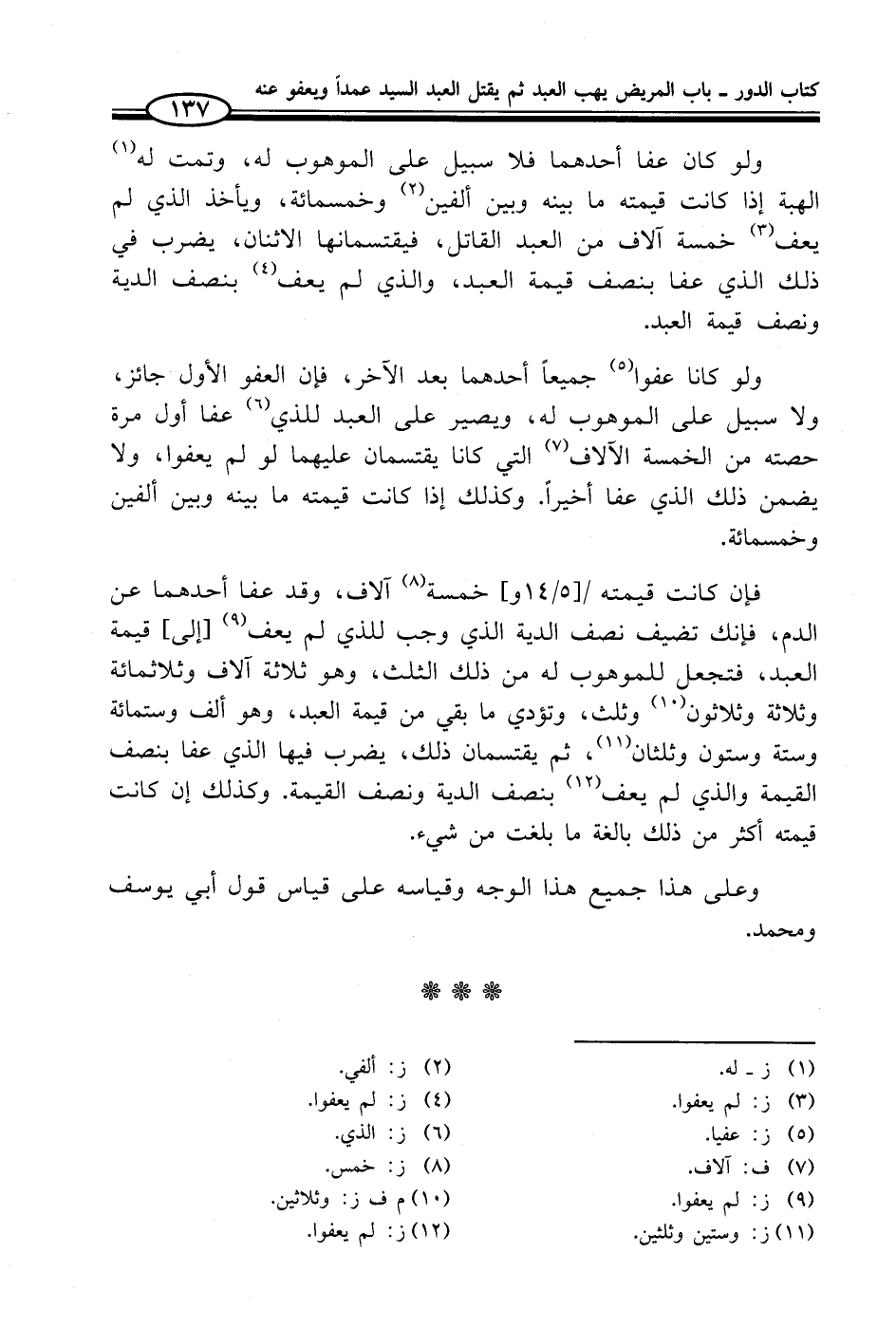 فإن كانت قيمته خمسة (¬8) آلاف، وقد عفا أحدهما عن الدم، فإنك تضيف نصف الدية الذي وجب للذي لم يعف (¬9) [إلى] قيمة العبد، فتجعل للموهوب له من ذلك الثلث، وهو ثلاثة آلاف وثلاثمائة وثلاثة وثلاثون (¬10) وثلث، وتؤدي ما بقي من قيمة العبد، وهو ألف وستمائة وستة وستون وثلثان (¬11)، ثم يقتسمان ذلك، يضرب فيها الذي عفا بنصف القيمة والذي لم يعف (¬12) بنصف الدية ونصف القيمة. وكذلك إن كانت قيمته أكثر من ذلك بالغة ما بلغت من شيء.