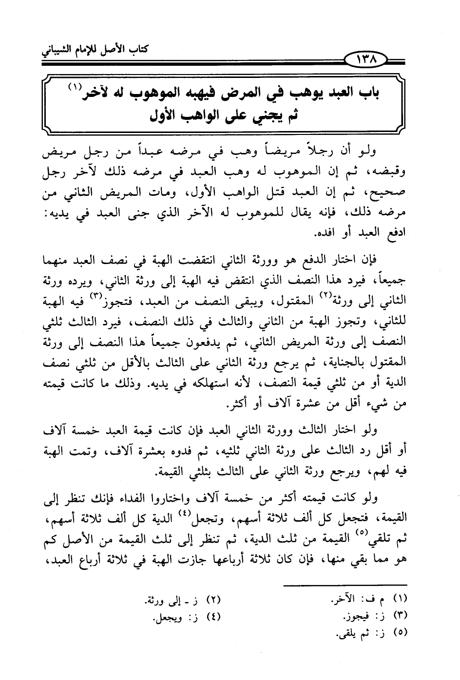 فإن اختار الدفع هو وورثة الثاني انتقضت الهبة في نصف العبد منهما جميعاً، فيرد هذا النصف الذي انتقض فيه الهبة إلى ورثة الثاني، ويرده ورثة الثاني إلى ورثة (¬2) المقتول، ويبقى النصف من العبد، فتجوز (¬3) فيه الهبة للثاني، وتجوز الهبة من الثاني والثالث في ذلك النصف، فيرد الثالث ثلثي النصف إلى ورثة المريض الثاني، ثم يدفعون جميعاً هذا النصف إلى ورثة المقتول بالجناية، ثم يرجع ورثة الثاني على الثالث بالأقل من ثلثي نصف الدية أو من ثلثي قيمة النصف، لأنه استهلكه في يديه. وذلك ما كانت قيمته من شيء أقل من عشرة آلاف أو أكثر.