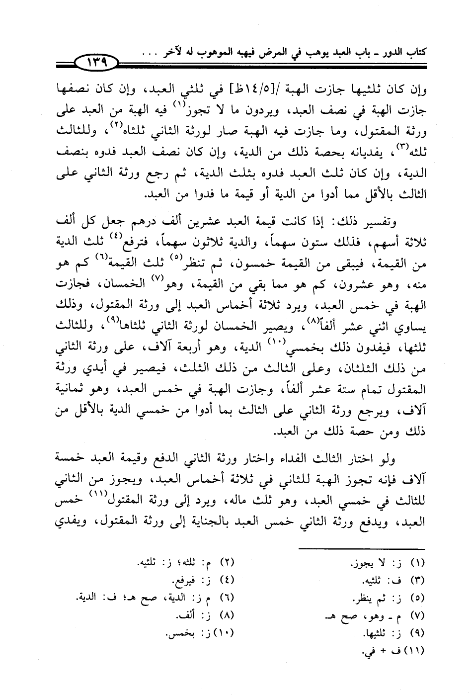 وتفسير ذلك: إذا كانت قيمة العبد عشرين ألف درهم جعل كل ألف ثلاثة أسهم، فذلك ستون سهماً، والدية ثلاثون سهماً، فترفع (¬4) ثلث الدية من القيمة، فيبقى من القيمة خمسون، ثم تنظر (¬5) ثلث القيمة (¬6) كم هو منه، وهو عشرون، كم هو مما بقي من القيمة، وهو (¬7) الخمسان، فجازت الهبة في خمس العبد، ويرد ثلاثة أخماس العبد إلى ورثة المقتول، وذلك يساوي اثني عشر ألفاً (¬8)، ويصير الخمسان لورثة الثاني ثلثاها (¬9)، وللثالث ثلثها، فيفدون ذلك بخمسي (¬10) الدية، وهو أربعة آلاف، على ورثة الثاني من ذلك الثلثان، وعلى الثالث من ذلك الثلث، فيصير في أيدي ورثة المقتول تمام ستة عشر ألفاً، وجازت الهبة في خمس العبد، وهو ثمانية آلاف، ويرجع ورثة الثاني على الثالث بما أدوا من خمسي الدية بالأقل من ذلك ومن حصة ذلك من العبد.