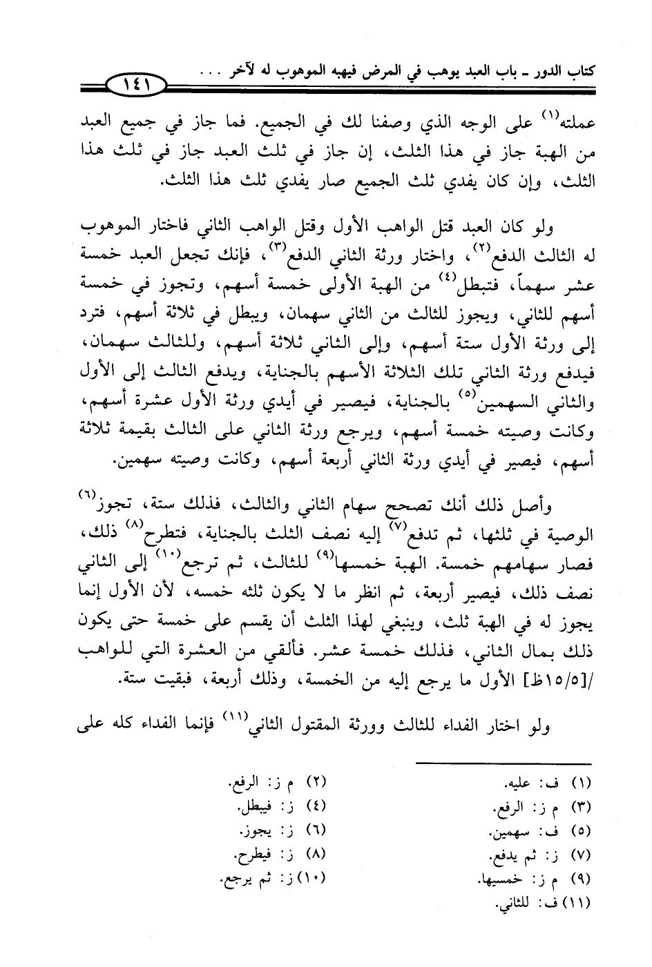 وأصل ذلك أنك تصحح سهام الثاني والثالث، فذلك ستة، تجوز (¬6) الوصية في ثلثها، ثم تدفع (¬7) إليه نصف الثلث بالجناية، فتطرح (¬8) ذلك، فصار سهامهم خمسة. الهبة خمسها (¬9) للثالث، ثم ترجع (¬10) إلى الثاني نصف ذلك، فيصير أربعة، ثم انظر ما لا يكون ثلثه خمسه، لأن الأول إنما يجوز له في الهبة ثلث، وينبغي لهذا الثلث أن يقسم على خمسة حتى يكون ذلك بمال الثاني، فذلك خمسة عشر. فألقي من العشرة التي للواهب الأول ما يرجع إليه من الخمسة، وذلك أربعة، فبقيت ستة.