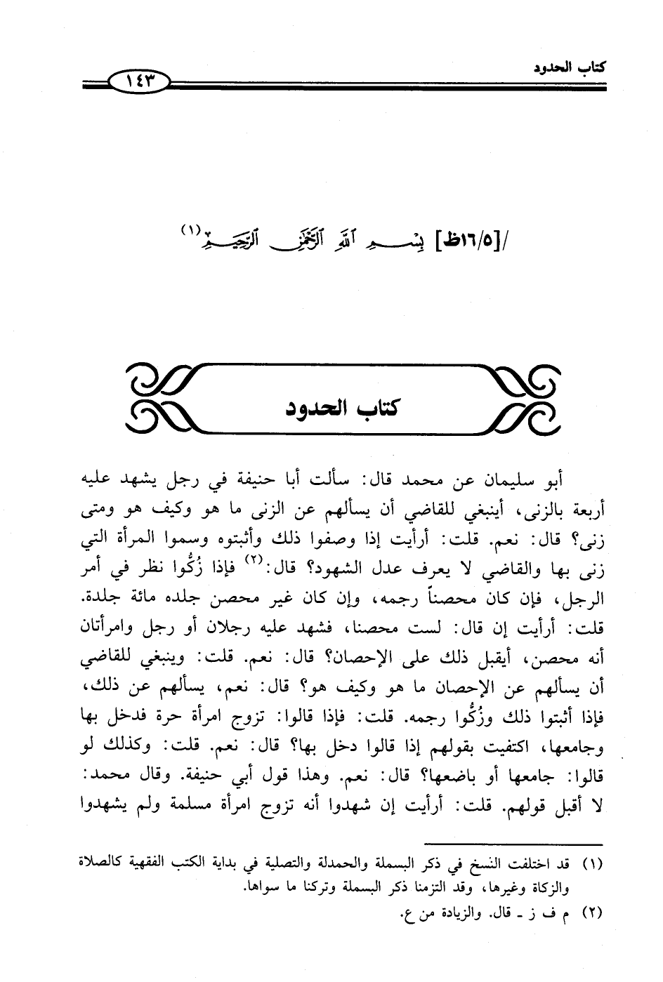 أبو سليمان عن محمد قال: سألت أبا حنيفة في رجل يشهد عليه أربعة بالزنى، أينبغي للقاضي أن يسألهم عن الزنى ما هو وكيف هو ومتى زنى؟ قال: نعم. قلت: أرأيت إذا وصفوا ذلك وأثبتوه وسموا المرأة التي زنى بها والقاضي لا يعرف عدل الشهود؟ قال: (¬2) فإذا زُكُوا نظر في أمر الرجل، فإن كان محصناً رجمه، وإن كان غير محصن جلده مائة جلدة. قلت: أرأيت إن قال: لست محصنا، فشهد عليه رجلان أو رجل وامرأتان أنه محصن، أيقبل ذلك على الإحصان؟ قال: نعم. قلت: وينبغي للقاضي أن يسألهم عن الإحصان ما هو وكيف هو؟ قال: نعم، يسألهم عن ذلك، فإذا أثبتوا ذلك وزُكُّوا رجمه. قلت: فإذا قالوا: تزوج امرأة حرة فدخل بها وجامعها، اكتفيت بقولهم إذا قالوا دخل بها؟ قال: نعم. قلت: وكذلك لو قالوا: جامعها أو باضعها؟ قال: نعم. وهذا قول أبي حنيفة. وقال محمد: لا أقبل قولهم. قلت: أرأيت إن شهدوا أنه تزوج امرأة مسلمة ولم يشهدوا