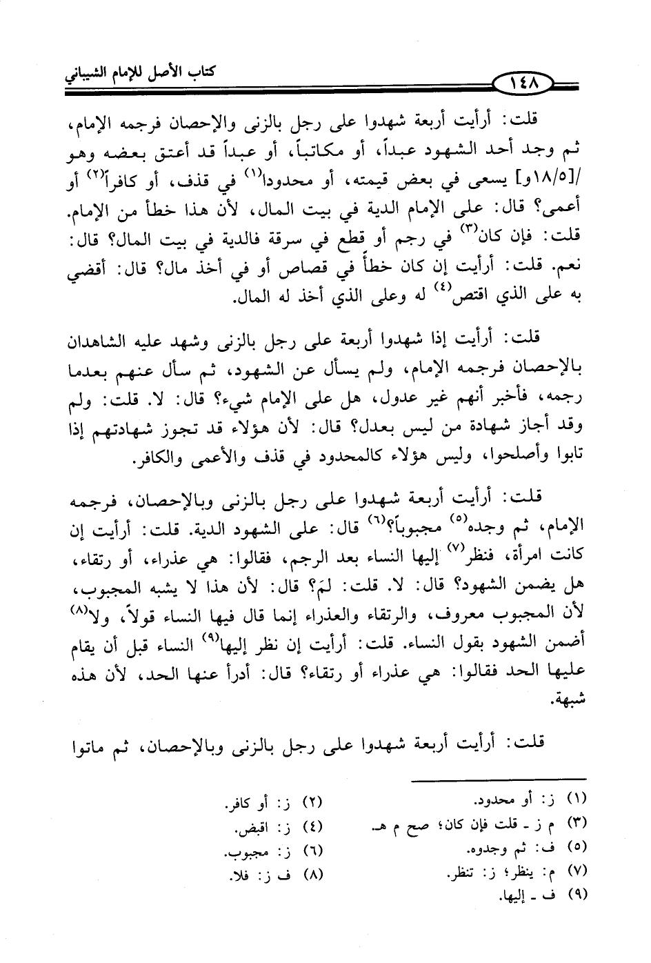 قلت: أرأيت أربعة شهدوا على رجل بالزنى وبالإحصان، فرجمه الإمام، ثم وجده (¬5) مجبوباً؟ (¬6) قال: على الشهود الدية. قلت: أرأيت إن كانت امرأة، فنظر (¬7) إليها النساء بعد الرجم، فقالوا: هي عذراء، أو رتقاء، هل يضمن الشهود؟ قال: لا. قلت: لمَ؟ قال: لأن هذا لا يشبه المجبوب، لأن المجبوب معروف، والرتقاء والعذراء إنما قال فيها النساء قولاً، ولا (¬8) أضمن الشهود بقول النساء. قلت: أرأيت إن نظر إليها (¬9) النساء قبل أن يقام عليها الحد فقالوا: هي عذراء أو رتقاء؟ قال: أدرأ عنها الحد، لأن هذه شبهة.