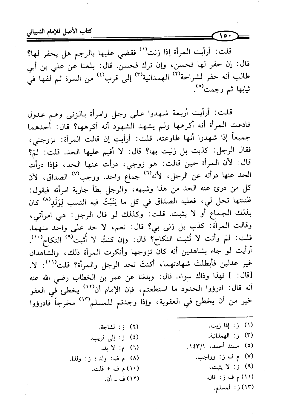 قلت: أرأيت أربعة شهدوا على رجل وامرأة بالزنى وهم عدول فادعت المرأة أنه أكرهها ولم يشهد الشهود أنه أكرهها؟ قال: أحدهما جميعاً إذا شهدوا أنها طاوعته. قلت: أرأيت إن قالت المرأة: تزوجني، فقال الرجل: كذبت بل زنيت بها؟ قال: لا أقيم عليها الحد. قلت: لمَ؟ قال: لأن المرأة حين قالت: هو زوجي، درأت عنها الحد، فإذا درأت الحد عنها درأته عن الرجل، لأنه (¬6) جماع واحد. ووجب (¬7) الصداق، لأن كل من درئ عنه الحد من هذا وشبهه، والرجل يطأ جارية امرأته فيقول: ظننتها تحل لي، فعليه الصداق في كل ما يَثْبُتُ فيه النسب لِوَلَدٍ (¬8) كان بذلك الجماع أو لا يثبت. قلت: وكذلك لو قال الرجل: هي امرأتي، وقالت المرأة: كذب بل زنى بي؟ قال: نعم، لا حد على واحد منهما. قلت: لمَ وأنت لا تُثبت النكاح؟ قال: وإن كنتُ لا أُثبت (¬9) النكاح (¬10). أرأيت لو جاء بشاهدين أنه كان تزوجها وأنكرت المرأة ذلك، والشاهدان غير عدلين فأبطلتَ شهادتهما، أكنتَ تحد الرجل والمرأة؟ قلت (¬11): لا. [قال:] فهذا وذاك سواء. قال: وبلغنا عن عمر بن الخطاب - رضي الله عنه - أنه قال: ادرؤوا الحدود ما استطعتم، فإن الإمام أن (¬12) يخطئ في العفو خير من أن يخطئ في العقوبة، وإذا وجدتم للمسلم (¬13) مخرجاً فادرؤوا