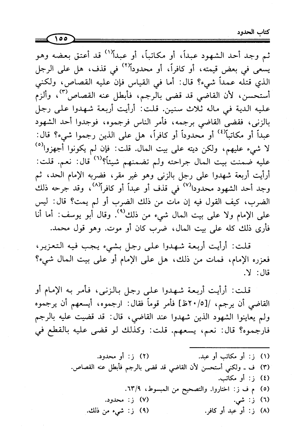 ثم وجد أحد الشهود عبداً، أو مكاتباً، أو عبداً (¬1) قد أعتق بعضه وهو يسعى في بعض قيمته، أو كافراً، أو محدودًا (¬2) في قذف، هل على الرجل الذي قتله عمداً شيء؟ قال: أما في القياس فإن عليه القصاص، ولكني أستحسن، لأن القاضي قد قضى بالرجم، فأبطل عنه القصاص (¬3)، وألزم عليه الدية في ماله ثلاث سنين. قلت: أرأيت أربعة شهدوا على رجل بالزنى، فقضى القاضي برجمه، فأمر الناس فرجموه، فوجدوا أحد الشهود عبداً أو مكاتباً (¬4) أو محدوداً أو كافراً، هل على الذين رجموا شيء؟ قال: لا شيء عليهم، ولكن ديته على بيت المال. قلت: فإن لم يكونوا أجهزوا (¬5) عليه ضمنت بيت المال جراحته ولم تضمنهم شيئاً؟ (¬6) قال: نعم. قلت: أرأيت أربعة شهدوا على رجل بالزنى وهو غير مقر، فضربه الإمام الحد، ثم وجد أحد الشهود محدودا (¬7) في قذف أو عبداً أو كافراً (¬8)، وقد جرحه ذلك الضرب، كيف القول فيه إن مات من ذلك الضرب أو لم يمت؟ قال: ليس على الإمام ولا على بيت المال شيء من ذلك (¬9). وقال أبو يوسف: أما أنا فأرى ذلك كله على بيت المال، ضرب كان أو موت. وهو قول محمد.