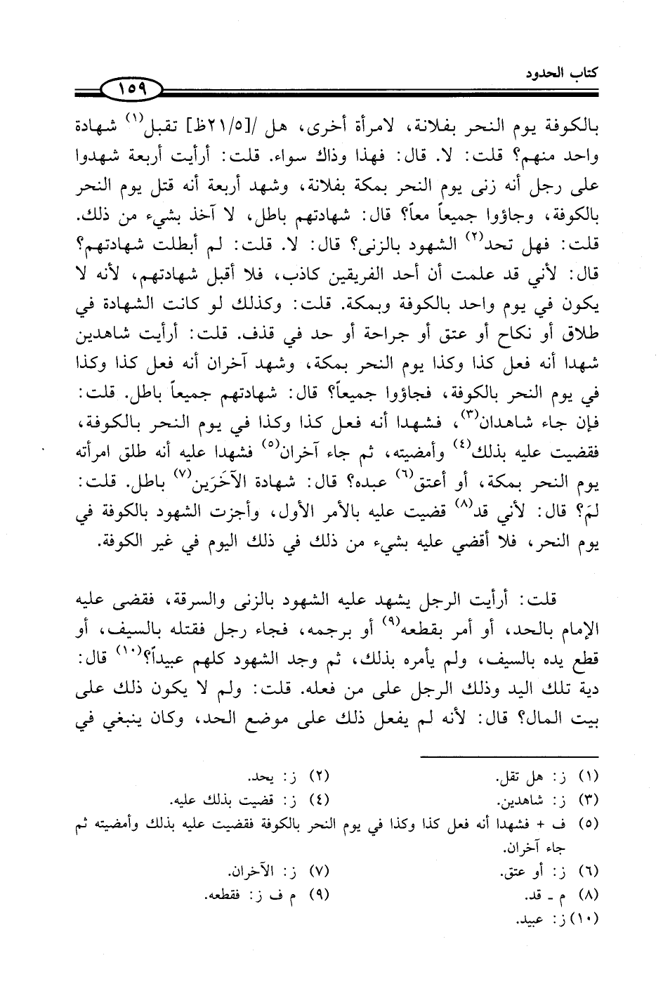 بالكوفة يوم النحر بفلانة، لامرأة أخرى، هل تقبل (¬1) شهادة واحد منهم؟ قلت: لا. قال: فهذا وذاك سواء. قلت: أرأيت أربعة شهدوا على رجل أنه زنى يوم النحر بمكة بفلانة، وشهد أربعة أنه قتل يوم النحر بالكوفة، وجاؤوا جميعاً معاً؟ قال: شهادتهم باطل، لا آخذ بشيء من ذلك. قلت: فهل تد (¬2) الشهود بالزنى؟ قال: لا. قلت: لم أبطلت شهادتهم؟ قال: لأني قد علمت أن أحد الفريقين كاذب، فلا أقبل شهادتهم، لأنه لا يكون في يوم واحد بالكوفة وبمكة. قلت: وكذلك لو كانت الشهادة في طلاق أو نكاح أو عتق أو جراحة أو حد في قذف. قلت: أرأيت شاهدين شهدا أنه فعل كذا وكذا يوم النحر بمكة، وشهد آخران أنه فعل كذا وكذا في يوم النحر بالكوفة، فجاؤوا جميعاً؟ قال: شهادتهم جميعاً باطل. قلت: فإن جاء شاهدان (¬3)، فشهدا أنه فعل كذا وكذا في يوم النحر بالكوفة، فقضيت عليه بذلك (¬4) وأمضيته، ثم جاء آخران (¬5) فشهدا عليه أنه طلق امرأته يوم النحر بمكة، أو أعتق (¬6) عبده؟ قال: شهادة الآخَرَين (¬7) باطل. قلت: لمَ؟ قال: لأني قد (¬8) قضيت عليه بالأمر الأول، وأجزت الشهود بالكوفة في يوم النحر، فلا أقضي عليه بشيء من ذلك في ذلك اليوم في غير الكوفة.