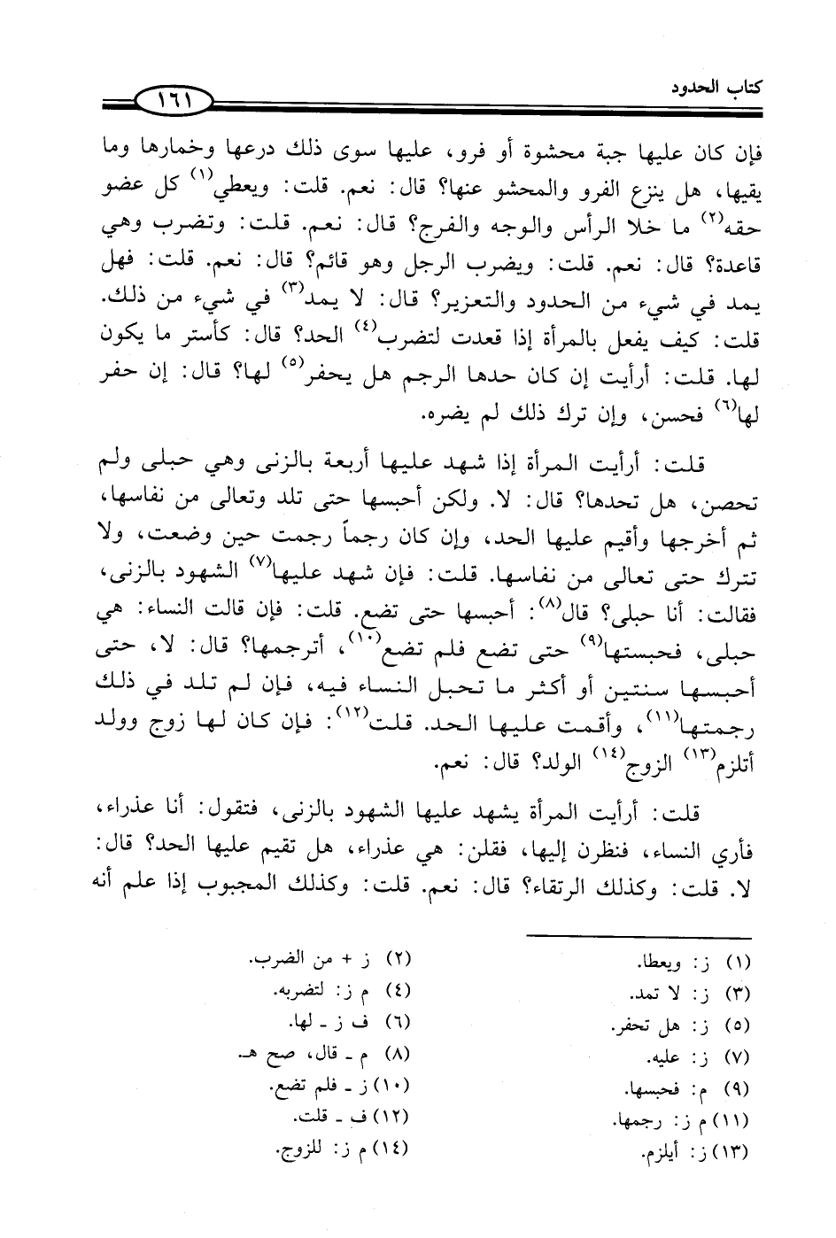 قلت: أرأيت المرأة إذا شهد عليها أربعة بالزنى وهي حبلى ولم تحصن، هل تحدها؟ قال: لا. ولكن أحبسها حتى تلد وتعالى من نفاسها، ثم أخرجها وأقيم عليها الحد، وإن كان رجمًا رجمت حين وضعت، ولا تترك حتى تعالى من نفاسها. قلت: فإن شهد عليها (¬7) الشهود بالزنى، فقالت: أنا حبلى؟ قال (¬8): أحبسها حتى تضع. قلت: فإن قالت النساء: هي حبلى، فحبستها (¬9) حتى تضع فلم تضع (¬10)، أترجمها؟ قال: لا، حتى أحبسها سنتين أو أكثر ما تحبل النساء فيه، فإن لم تلد في ذلك رجمتها (¬11)، وأقمت عليها الحد. قلت (¬12): فإن كان لها زوج وولد أتلزم (¬13) الزوج (¬14) الولد؟ قال: نعم.