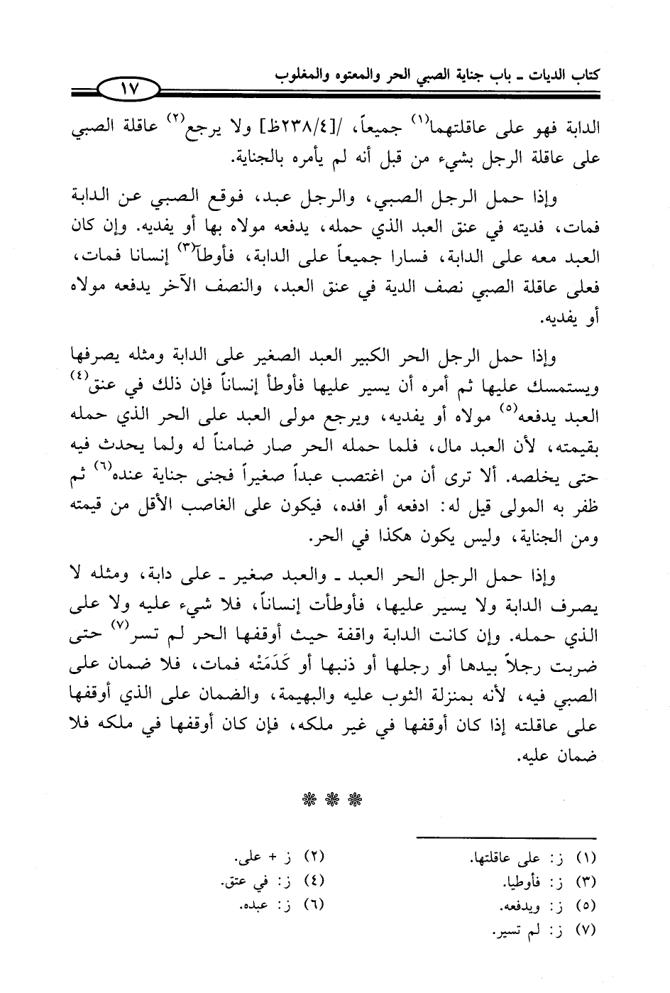 وإذا حمل الرجل الحر العبد - والعبد صغير- على دابة، ومثله لا يصرف الدابة ولا يسير عليها، فأوطأت إنساناً، فلا شيء عليه ولا على الذي حمله. وإن كانت الدابة واقفة حيث أوقفها الحر لم تسر (¬7) حتى ضربت رجلاً بيدها أو رجلها أو ذنبها أو كَدَمَتْه فمات، فلا ضمان على الصبي فيه، لأنه بمنزلة الثوب عليه والبهيمة، والضمان على الذي أوقفها على عاقلته إذا كان أوقفها في غير ملكه، فإن كان أوقفها في ملكه فلا ضمان عليه