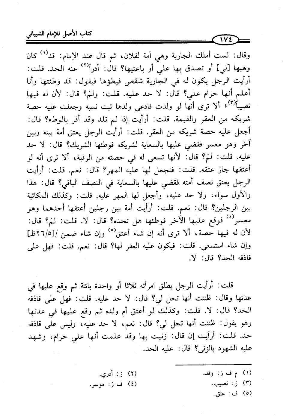 وقال: لست أملك الجارية وهي أمة لفلان، ثم قال عند الإمام: قد (¬1) كان وهبها [لي] أو تصدق بها علي أو باعنيها؟ قال: أدرأ (¬2) عنه الحد. قلت: أرأيت الرجل يكون له في الجارية شقص فيطؤها فيقول: قد وطئتها وأنا أعلم أنها حرام علي؟ قال: لا حد عليه. قلت: ولمَ؟ قال: لأن له فيها نصيباً (¬3)؛ ألا ترى أنها لو ولدت فادعى ولدها ثبت نسبه وجعلت عليه حصة شريكه من العقر والقيمة. قلت: أرأيت إذا لم تلد وقد أقر بالوطء؟ قال: أجعل عليه حصة شريكه من العقر. قلت: أرأيت الرجل يعتق أمة بينه وبين آخر وهو معسر فقضي عليها بالسعاية لشريكه فوطئها الشريك؟ قال: لا حد عليه. قلت: لمَ؟ قال: لأنها تسعى له في حصته من الرقبة، ألا ترى أنه لو أعتقها جاز عتقه. قلت: فتجعل لها عليه المهر؟ قال: نعم. قلت: أرأيت الرجل يعتق نصف أمته فقضي عليها بالسعاية في النصف الباقي؟ قال: هذا والأول سواء، ولا حد عليه، وأجعل لها المهر عليه. قلت: وكذلك المكاتبة بين الرجلين؟ قال: نعم. قلت: أرأيت أمة بين رجلين أعتقها أحدهما وهو معسر (¬4) فوقع عليها الآخر فوطئها هل تحده؟ قال: لا. قلت: لمَ؟ قال: لأن له فيها حصة، ألا ترى أنه إن شاء أعتق (¬5) وإن شاء ضمن وإن شاء استسعى. قلت: فيكون عليه العقر لها؟ قال: نعم. قلت: فهل على قاذفه الحد؟ قال: لا.