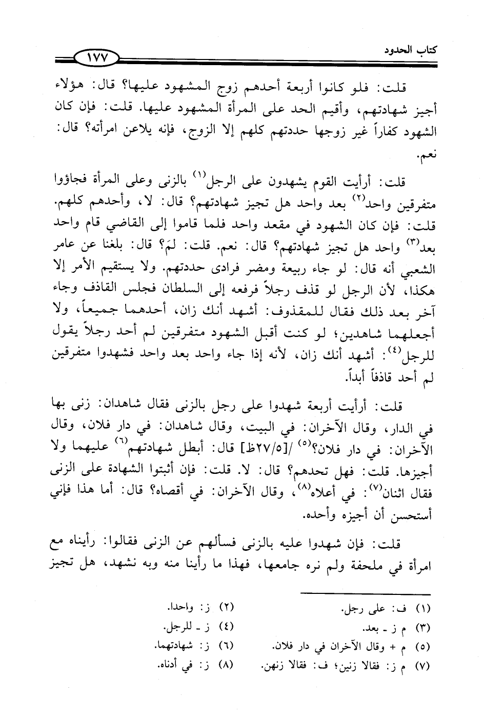 قلت: أرأيت القوم يشهدون على الرجل (¬1) بالزنى وعلى المرأة فجاؤوا متفرقين واحد (¬2) بعد واحد هل تجيز شهادتهم؟ قال: لا، وأحدهم كلهم. قلت: فإن كان الشهود في مقعد واحد فلما قاموا إلى القاضي قام واحد بعد (¬3) واحد هل تجيز شهادتهم؟ قال: نعم. قلت: لمَ؟ قال: بلغنا عن عامر الشعبي أنه قال: لو جاء ربيعة ومضر فرادى حددتهم. ولا يستقيم الأمر إلا هكذا، لأن الرجل لو قذف رجلاً فرفعه إلى السلطان فجلس القاذف وجاء آخر بعد ذلك فقال للمقذوف: أشهد أنك زان، أحدهما جميعاً، ولا أجعلهما شاهدين؛ لو كنت أقبل الشهود متفرقين لم أحد رجلاً يقول للرجل (¬4): أشهد أنك زان، لأنه إذا جاء واحد بعد واحد فشهدوا متفرقين لم أحد قاذفاً أبداً.