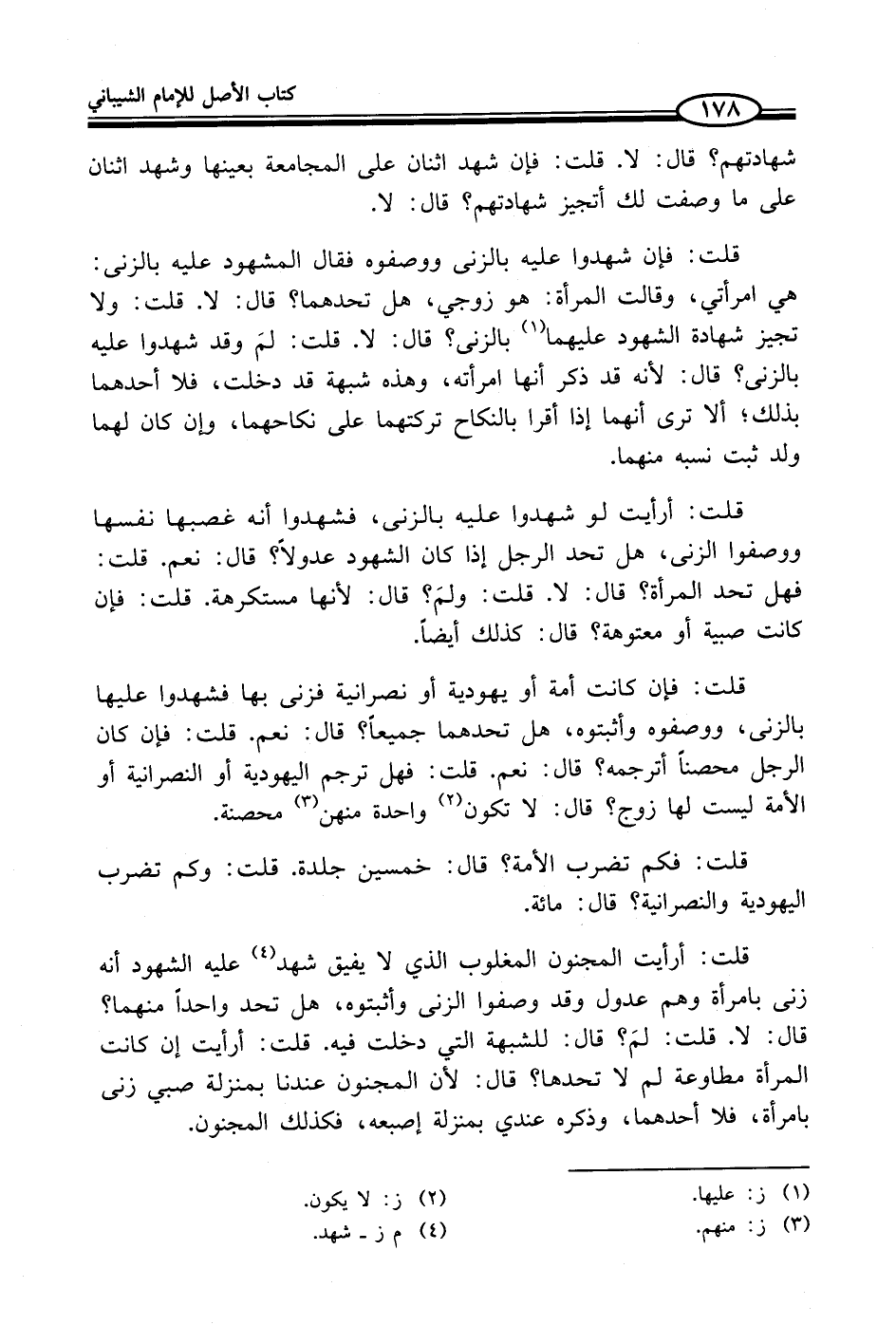 قلت: أرأيت لو شهدوا عليه بالزنى، فشهدوا أنه غصبها نفسها ووصفوا الزنى، هل تحد الرجل إذا كان الشهود عدولاً؟ قال: نعم. قلت: فهل تحد المرأة؟ قال: لا. قلت: ولمَ؟ قال: لأنها مستكرهة. قلت: فإن كانت صبية أو معتوهة؟ قال: كذلك أيضاً.