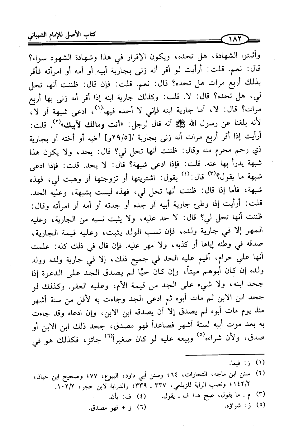 وأثبتوا الشهادة، هل تحده، ويكون الإقرار في هذا وشهادة الشهود سواء؟ قال: نعم. قلت: أرأيت لو أقر أنه زنى بجارية أبيه أو أمه أو امرأته فأقر بذلك أربع مرات هل تحده؟ قال: نعم. قلت: فإن قال: ظننت أنها تحل لي، هل تحده؟ قال: لا. قلت: وكذلك جارية ابنه إذا أقر أنه زنى بها أربع مرات؟ قال: لا، أما جارية ابنه فإني لا أحده فيها (¬1)، ادعى شبهة أو لا، لأنه بلغنا عن رسول الله - صلى الله عليه وسلم - أنه قال لرجل: "أنت ومالك لأبيك" (¬2). قلت: أرأيت إذا أقر أربع مرات أنه زنى بجارية أخيه أو أخته أو بجارية ذي رحم محرم منه وقال: ظننت أنها تحل لي؟ قال: يحد، ولا يكون هذا شبهة يدرأ بها عنه. قلت: فإذا ادعى شبهة؟ قال: لا يحد. قلت: فإذا ادعى شبهة ما يقول؟ (¬3) قال: (¬4) يقول: اشتريتها أو تزوجتها أو وهبت لي، فهذه شبهة، فأما إذا قال: ظننت أنها تحل لي، فهذه ليست بشبهة، وعليه الحد. قلت: أرأيت إذا وطئ جارية أبيه أو جده أوأمه أو امرأته وقال: ظننت أنها تحل لي؟ قال: لا حد عليه، ولا يثبت نسبه من الجارية، وعليه المهر إلا في جارية ولده، فإن نسب الولد يثبت، وعليه قيمة الجارية، صدقه في وطئه إياها أو كذبه، ولا مهر عليه. فإن قال في ذلك كله: علمت أنها علي حرام، أقيم عليه الحد في جميع ذلك، إلا في جارية ولده وولد ولده إن كان أبوهم ميتاً، وإن كان حيًّا لم يصدق الجد على الدعوة إذا جحد ابنه، ولا شيء على الجد من قيمة الأم، وعليه العقر. وكذلك لو جحد ابن الابن ثم مات أبوه ثم ادعى الجد وجاءت به لأقل من ستة أشهر منذ يوم مات أبوه لم يصدق إلا أن يصدقه ابن الابن، وإن ادعاه وقد جاءت به بعد موت أبيه لستة أشهر فصاعداً فهو مصدق، جحد ذلك ابن الابن أو صدق، ولأن شراءه (¬5) وبيعه عليه لو كان صغيراً (¬6) جائز، فكذلك هو في