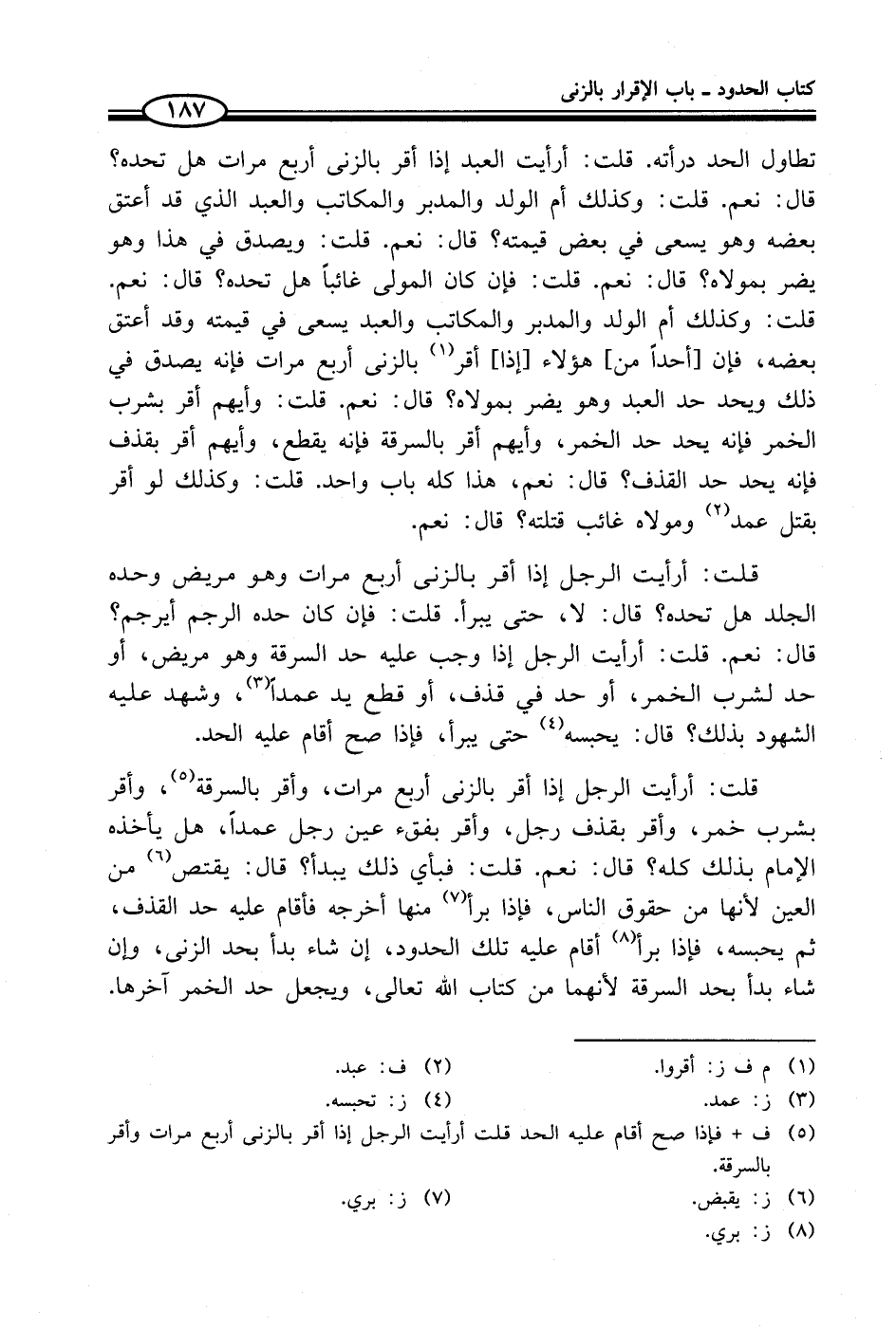 تطاول الحد درأته. قلت: أرأيت العبد إذا أقر بالزنى أربع مرات هل تحده؟ قال: نعم. قلت: وكذلك أم الولد والمدبر والمكاتب والعبد الذي قد أعتق بعضه وهو يسعى في بعض قيمته؟ قال: نعم. قلت: ويصدق في هذا وهو يضر بمولاه؟ قال: نعم. قلت: فإن كان المولى غائباً هل تحده؟ قال: نعم. قلت: وكذلك أم الولد والمدبر والمكاتب والعبد يسعى في قيمته وقد أعتق بعضه، فإن [أحداً من] هؤلاء [إذا] أقر (¬1) بالزنى أربع مرات فإنه يصدق في ذلك ويحد حد العبد وهو يضر بمولاه؟ قال: نعم. قلت: وأيهم أقر بشرب الخمر فإنه يحد حد الخمر، وأيهم أقر بالسرقة فإنه يقطع، وأيهم أقر بقذف فإنه يحد حد القذف؟ قال: نعم، هذا كله باب واحد. قلت: وكذلك لو أقر بقتل عمد (¬2) ومولاه غائب قتلته؟ قال: نعم.