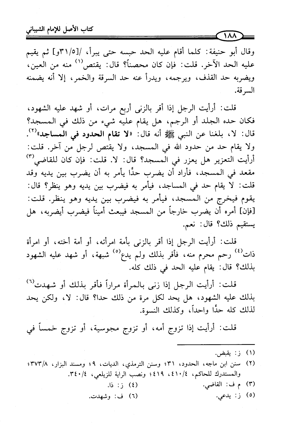 قلت: أرأيت الرجل إذا أقر بالزنى أربع مرات، أو شهد عليه الشهود، فكان حده الجلد أو الرجم، هل يقام عليه شيء من ذلك في المسجد؟ قال: لا، بلغنا عن النبي - صلى الله عليه وسلم - أنه قال: "لا تقام الحدود في المساجد" (¬2). ولا يقام حد من حدود الله في المسجد، ولا يقتص لرجل من آخر. قلت: أرأيت التعزير هل يعزر في المسجد؟ قال: لا. قلت: فإن كان للقاضي (¬3) مقعد في المسجد، فأراد أن يضرب حدًّا يأمر به أن يضرب بين يديه وقد قلت: لا يقام حد في المساجد، فيأمر به فيضرب بين يديه وهو ينظر؟ قال: يقوم فيخرج من المسجد، فيأمر به فيضرب بين يديه وهو ينظر. قلت: [فإن] أمره أن يضرب خارجاً من المسجد فيبعث أميناً فيضرب أيضربه، هل يستقيم ذلك؟ قال: نعم.