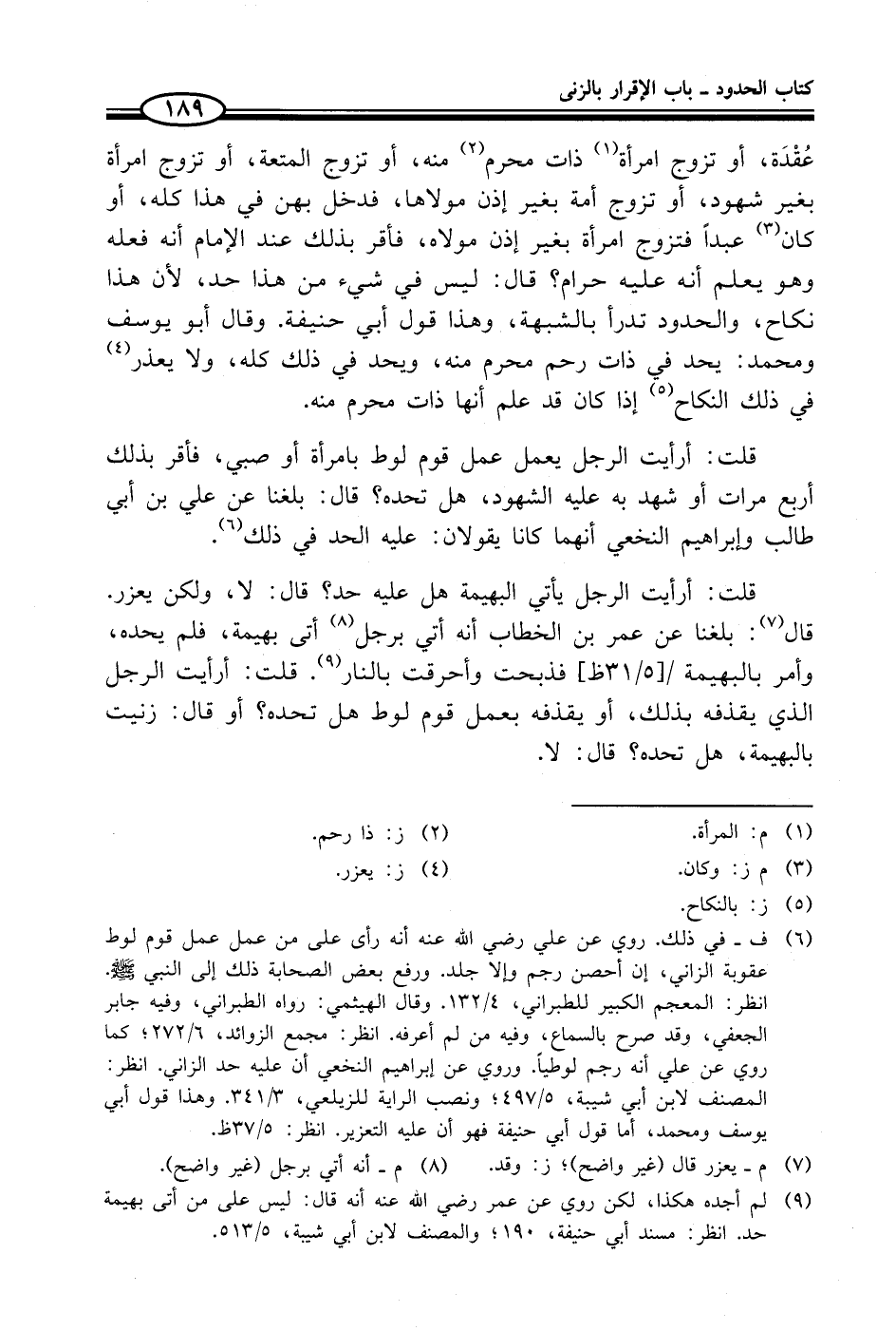 (¬9) لم أجده هكذا، لكن روي عن عمر - رضي الله عنه - أنه قال: ليس على من أتى بهيمة حد. انظر: مسند أبي حنيفة، 190؛ والمصنف لابن أبي شيبة، 5/ 513.