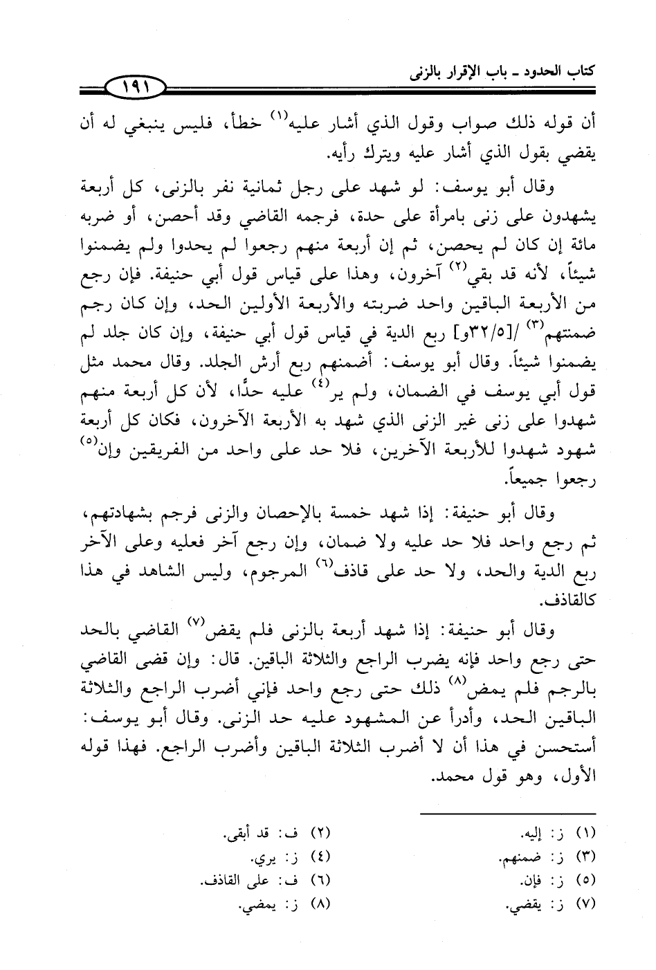 وقال أَبو يوسف: لو شهد على رجل ثمانية نفر بالزنى، كل أربعة يشهدون على زنى بامرأة على حدة، فرجمه القاضي وقد أحصن، أو ضربه مائة إن كان لم يحصن، ثم إن أربعة منهم رجعوا لم يحدوا ولم يضمنوا شيئاً، لأنه قد بقي (¬2) آخرون، وهذا على قياس قول أبي حنيفة. فإن رجع من الأربعة الباقين واحد ضربته والأربعة الأولين الحد، وإن كان رجم ضمنتهم (¬3) ربع الدية في قياس قول أبي حنيفة، وإن كان جلد لم يضمنوا شيئاً. وقال أَبو يوسف: أضمنهم ربع أرش الجلد. وقال محمد مثل قول أبي يوسف في الضمان، ولم ير (¬4) عليه حدًّا، لأن كل أربعة منهم شهدوا على زنى غير الزنى الذي شهد به الأربعة الآخرون، فكان كل أربعة شهود شهدوا للأربعة الآخرين، فلا حد على واحد من الفريقين وإن (¬5) رجعوا جميعاً.