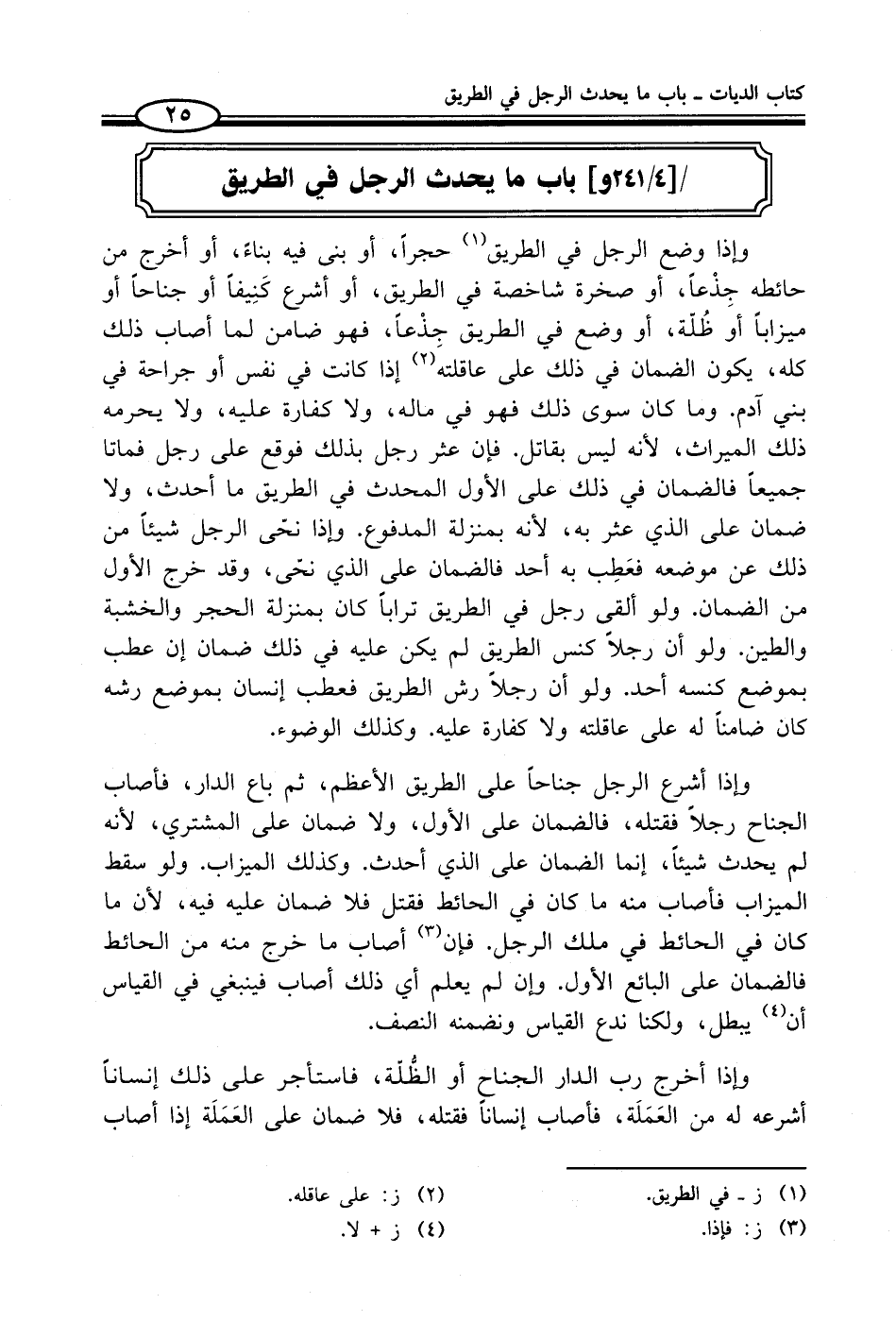 وإذا وضع الرجل في الطريق (¬1) حجراً، أو بنى فيه بناءً، أو أخرج من حائطه جِذْعاً، أو صخرة شاخصة في الطريق، أو أشرع كَنِيفاً أو جناحًا أو ميزاباً أو ظُلّة، أو وضع في الطريق جِذْعًا، فهو ضامن لما أصاب ذلك كله، يكون الضمان في ذلك على عاقلته (¬2) إذا كانت في نفس أو جراحة في بني آدم. وما كان سوى ذلك فهو في ماله، ولا كفارة عليه، ولا يحرمه ذلك الميراث، لأنه ليس بقاتل. فإن عشر رجل بذلك فوقع على رجل فماتا جميعاً فالضمان في ذلك على الأول المحدث في الطريق ما أحدث، ولا ضمان على الذي عشر به، لأنه بمنزلة المدفوع. وإذا نحّى الرجل شيئاً من ذلك عن موضعه فعَطِب به أحد فالضمان على الذي نحّى، وقد خرج الأول من الضمان. ولو ألقى رجل في الطريق ترابًا كان بمنزلة الحجر والخشبة والطين. ولو أن رجلاً كنس الطريق لم يكن عليه في ذلك ضمان إن عطب بموضع كنسه أحد. ولو أن رجلاً رش الطريق فعطب إنسان بموضع رشه كان ضامناً له على عاقلته ولا كفارة عليه. وكذلك الوضوء.