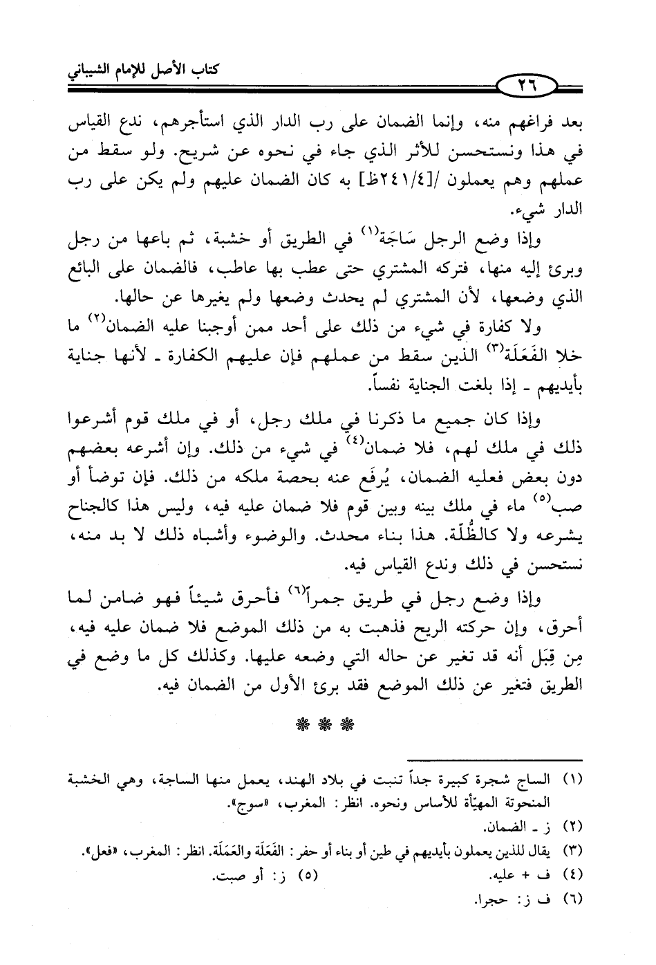 وإذا وضع الرجل سَاجَة (¬1) في الطريق أو خشبة، ثم باعها من رجل وبرئ إليه منها، فتركه المشتري حتى عطب بها عاطب، فالضمان على البائع الذي وضعها، لأن المشتري لم يحدث وضعها ولم يغيرها عن حالها. ولا كفارة في شيء من ذلك على أحد ممن أوجبنا عليه الضمان (¬2) ما خلا الفَعَلَة (¬3) الذين سقط من عملهم فإن عليهم الكفارة - لأنها جناية بأيديهم - إذا بلغت الجناية نفسًا.