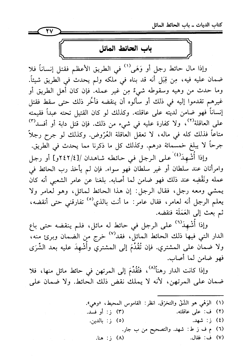 فإذا مال حائط رجل أو وَهَى (¬1) في الطريق الأعظم فقتل إنساناً فلا ضمان عليه فيه، مِن قِبَل أنه قد بناه في ملكه ولم يحدث في الطريق شيئاً. وما حدث من وهيه وسقوطه شيءٌ مِن غير عمله. فإن كان أهل الطريق أو غيرهم تقدموا إليه في ذلك أو سألوه أن ينقضه فأخر ذلك حتى سقط فقتل إنساناً فهو ضامن لديته على عاقلته. وكذلك لو كان القتيل تحته عبداً فقيمته على العاقلة (¬2)، ولا كفارة عليه في شيء من ذلك. فإن قتل دابة أو أفسد (¬3) متاعاً فذلك كله في ماله، لا تعقل العاقلة العُرُوض. وكذلك لو جرح رجلاً جرحاً لا يبلغ خمسمائة درهم. وكذلك كل ما ذكرنا مما يحدث في الطريق. وإذا أُشْهِدَ (¬4) على الرجل في حائطه شاهدان أو رجل وامرأتان عند سلطان أو غير سلطان فهو سواء. فإن لم يأخذ رب الحائط في عمله ونَقْضِه عند ذلك فهو ضامن لما أصابه. بلغنا عن عامر الشعبي أنه كان يمشي ومعه رجل، فقال الرجل: إن هذا الحائط لمائل، وهو لعامر ولا يعلم الرجل أنه لعامر، فقال عامر: ما أنت بالذي (¬5) تفارقني حتى أنقضه، ثم بعث إلى العَمَلَة فنقضه.