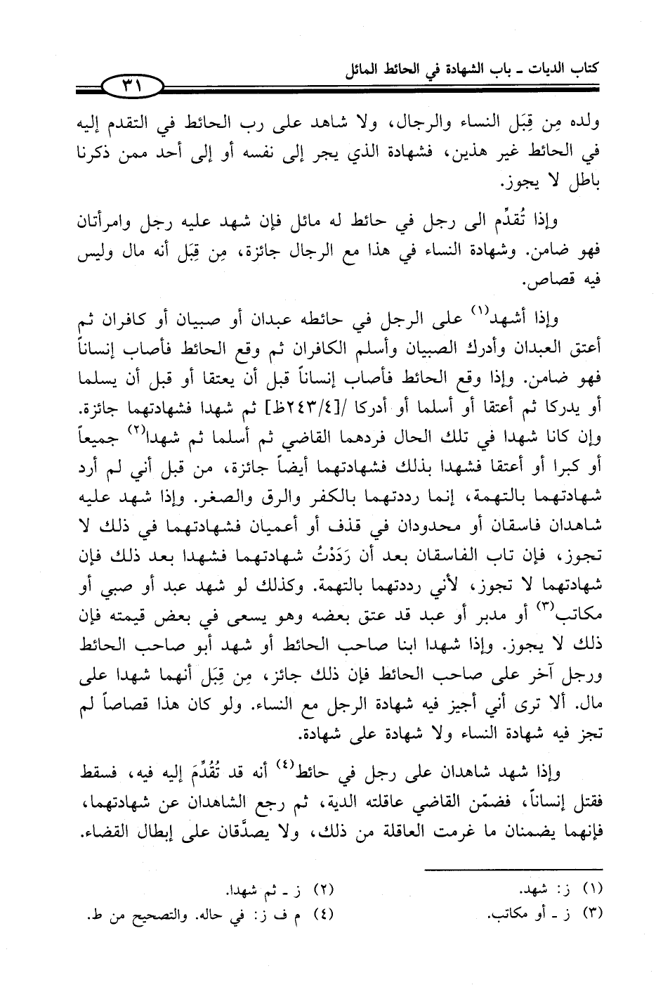 وإذا أشهد (¬1) على الرجل في حائطه عبدان أو صبيان أو كافران ثم أعتق العبدان وأدرك الصبيان وأسلم الكافران ثم وقع الحائط فأصاب إنساناً فهو ضامن. وإذا وقع الحائط فأصاب إنساناً قبل أن يعتقا أو قبل أن يسلما أو يدركا ثم أعتقا أو أسلما أو أدركا ثم شهدا فشهادتهما جائزة. وإن كانا شهدا في تلك الحال فردهما القاضي ثم أسلما ثم شهدا (¬2) جميعاً أو كبرا أو أعتقا فشهدا بذلك فشهادتهما أيضاً جائزة، من قبل أني لم أرد شهادتهما بالتهمة، إنما رددتهما بالكفر والرق والصغر. وإذا شهد عليه شاهدان فاسقان أو محدودان في قذف أو أعميان فشهادتهما في ذلك لا تجوز، فإن تاب الفاسقان بعد أن رَدَدْتُ شهادتهما فشهدا بعد ذلك فإن شهادتهما لا تجوز، لأني رددتهما بالتهمة. وكذلك لو شهد عبد أو صبي أو مكاتب (¬3) أو مدبر أو عبد قد عتق بعضه وهو يسعى في بعض قيمته فإن ذلك لا يجوز. وإذا شهدا ابنا صاحب الحائط أو شهد أبو صاحب الحائط ورجل آخر على صاحب الحائط فإن ذلك جائز، مِن قِبَل أنهما شهدا على مال. ألا ترى أني أجيز فيه شهادة الرجل مع النساء. ولو كان هذا قصاصاً لم تجز فيه شهادة النساء ولا شهادة على شهادة.