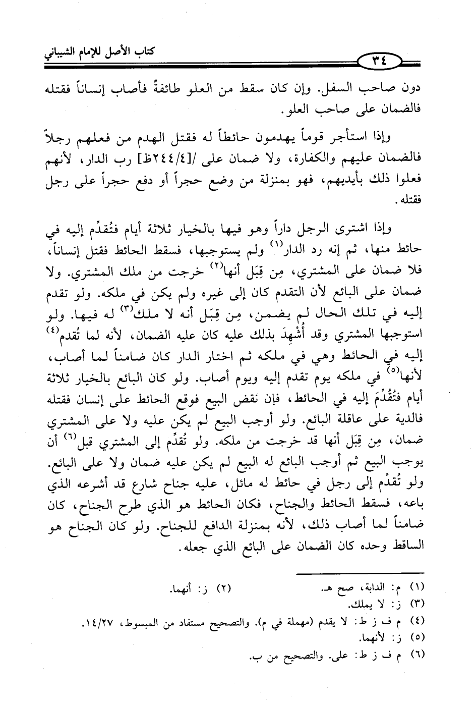 وإذا اشترى الرجل داراً وهو فيها بالخيار ثلاثة أيام فتقدِّم إليه في حائط منها، ثم إنه رد الدار (¬1) ولم يستوجبها، فسقط الحائط فقتل إنساناً، فلا ضمان على المشتري، مِن قِبَل أنها (¬2) خرجت من ملك المشتري. ولا ضمان على البائع لأن التقدم كان إلى غيره ولم يكن في ملكه. ولو تقدم إليه في تلك الحال لم يضمن، مِن قِبَل أنه لا ملك (¬3) له فيها. ولو استوجبها المشتري وقد أُشْهِدَ بذلك عليه كان عليه الضمان، لأنه لما تُقدم (¬4) إليه في الحائط وهي في ملكه ثم اختار الدار كان ضامناً لما أصاب، لأنها (¬5) في ملكه يوم تقدم إليه ويوم أصاب. ولو كان البائع بالخيار ثلاثة أيام فتُقُدِّمَ إليه في الحائط، فإن نقض البيع فوقع الحائط على إنسان فقتله فالدية على عاقلة البائع. ولو أوجب البيع لم يكن عليه ولا على المشتري ضمان، مِن قِبَل أنها قد خرجت من ملكه. ولو تُقدَّم إلى المشتري قبل (¬6) أن يوجب البيع ثم أوجب البائع له البيع لم يكن عليه ضمان ولا على البائع. ولو تُقدَّم إلى رجل في حائط له مائل، عليه جناح شارع قد أشرعه الذي باعه، فسقط الحائط والجناح، فكان الحائط هو الذي طرح الجناح، كان ضامناً لما أصاب ذلك، لأنه بمنزلة الدافع للجناح. ولو كان الجناح هو الساقط وحده كان الضمان على البائع الذي جعله.