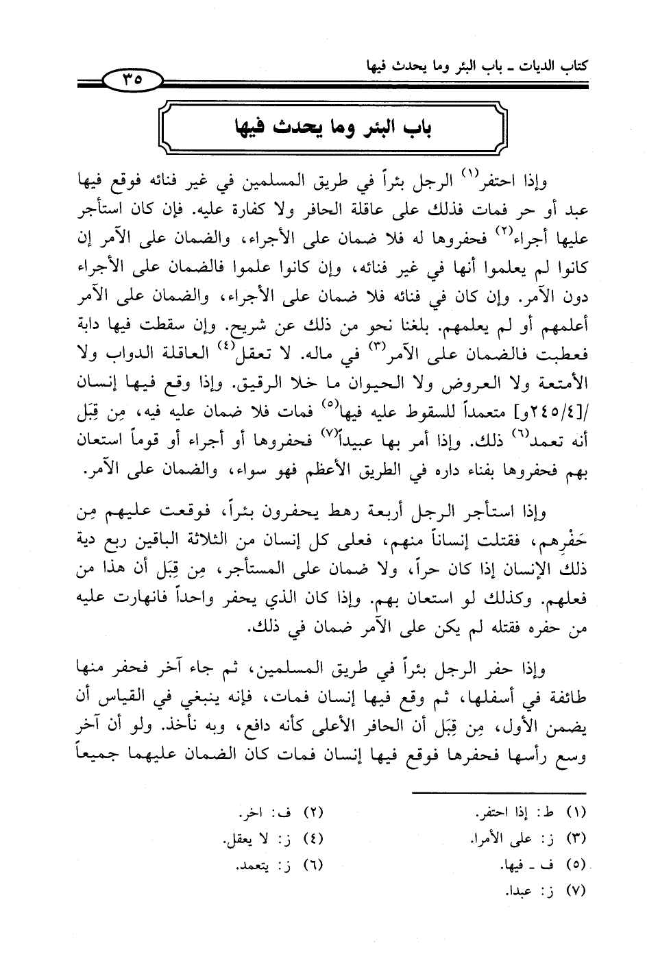 وإذا احتفر (¬1) الرجل بئراً في طريق المسلمين في غير فنائه فوقع فيها عبد أو حر فمات فذلك على عاقلة الحافر ولا كفارة عليه. فإن كان استأجر عليها أجراء (¬2) فحفروها له فلا ضمان على الأجراء، والضمان على الآمر إن كانوا لم يعلموا أنها في غير فنائه، وإن كانوا علموا فالضمان على الأجراء دون الآمر. وإن كان في فنائه فلا ضمان على الأجراء، والضمان على الآمر أعلمهم أو لم يعلمهم. بلغنا نحو من ذلك عن شريح. وإن سقطت فيها دابة فعطبت فالضمان على الآمر (¬3) في ماله. لا تعقل (¬4) العاقلة الدواب ولا الأمتعة ولا العروض ولا الحيوان ما خلا الرقيق. وإذا وقع فيها إنسان متعمداً للسقوط عليه فيها (¬5) فمات فلا ضمان عليه فيه، مِن قِبَل أنه تعمد (¬6) ذلك. وإذا أمر بها عبيداً (¬7) فحفروها أو أجراء أو قوماً استعان بهم فحفروها بفناء داره في الطريق الأعظم فهو سواء، والضمان على الآمر.
