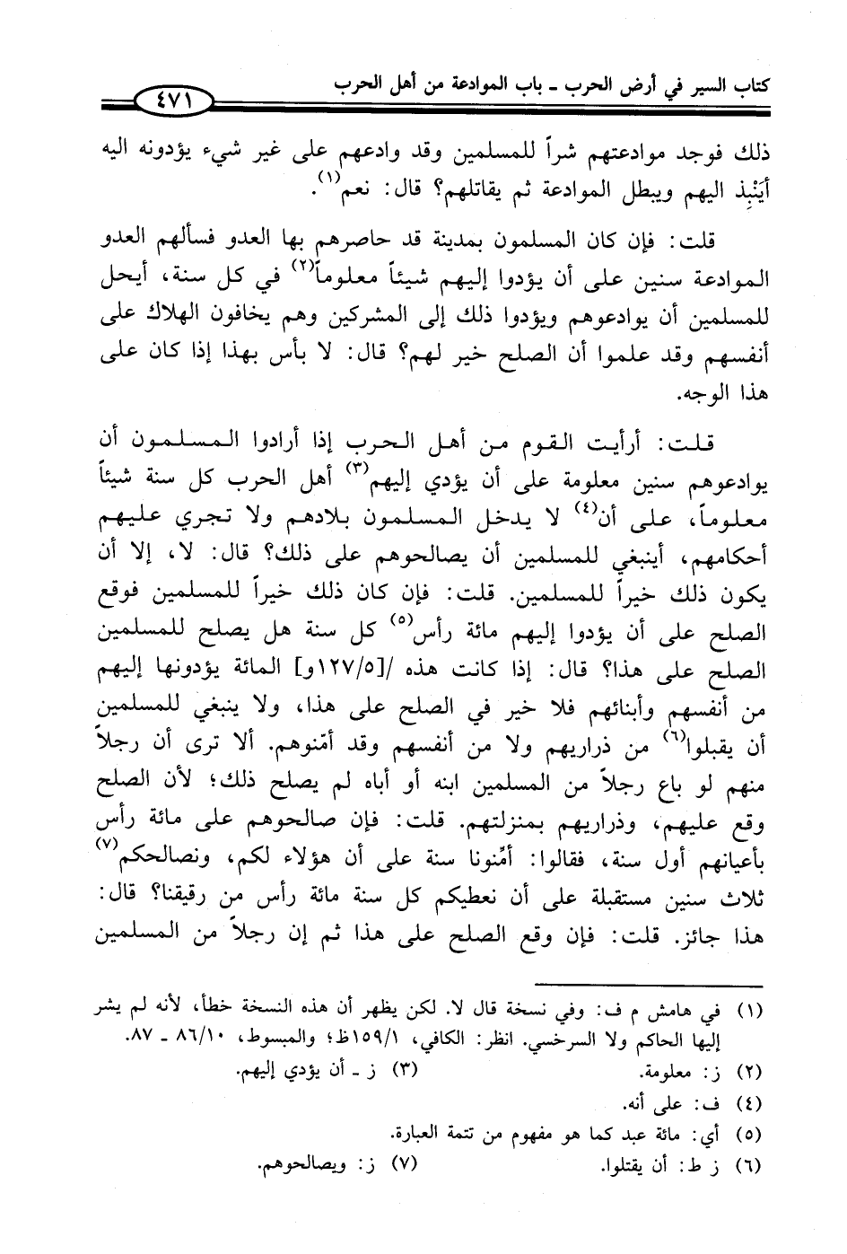 قلت: أرأيت القوم من أهل الحرب إذا أرادوا المسلمون أن يوادعوهم سنين معلومة على أن يؤدي إليهم (¬3) أهل الحرب كل سنة شيئاً معلوماً، على أن (¬4) لا يدخل المسلمون بلادهم ولا تجري عليهم أحكامهم، أينبغي للمسلمين أن يصالحوهم على ذلك؟ قال: لا، إلا أن يكون ذلك خيراً للمسلمين. قلت: فإن كان ذلك خيراً للمسلمين فوقع الصلح على أن يؤدوا إليهم مائة رأس (¬5) كل سنة هل يصلح للمسلمين الصلح على هذا؟ قال: إذا كانت هذه المائة يؤدونها إليهم من أنفسهم وأبنائهم فلا خير في الصلح على هذا، ولا ينبغي للمسلمين أن يقبلوا (¬6) من ذراريهم ولا من أنفسهم وقد أمّنوهم. ألا ترى أن رجلاً منهم لو باع رجلاً من المسلمين ابنه أو أباه لم يصلح ذلك؛ لأن الصلح وقع عليهم، وذراريهم بمنزلتهم. قلت: فإن صالحوهم على مائة رأس بأعيانهم أول سنة، فقالوا: أمِّنونا سنة على أن هؤلاء لكم، ونصالحكم (¬7) ثلاث سنين مستقبلة على أن نعطيكم كل سنة مائة رأس من رقيقنا؟ قال: هذا جائز. قلت: فإن وقع الصلح على هذا ثم إن رجلاً من المسلمين