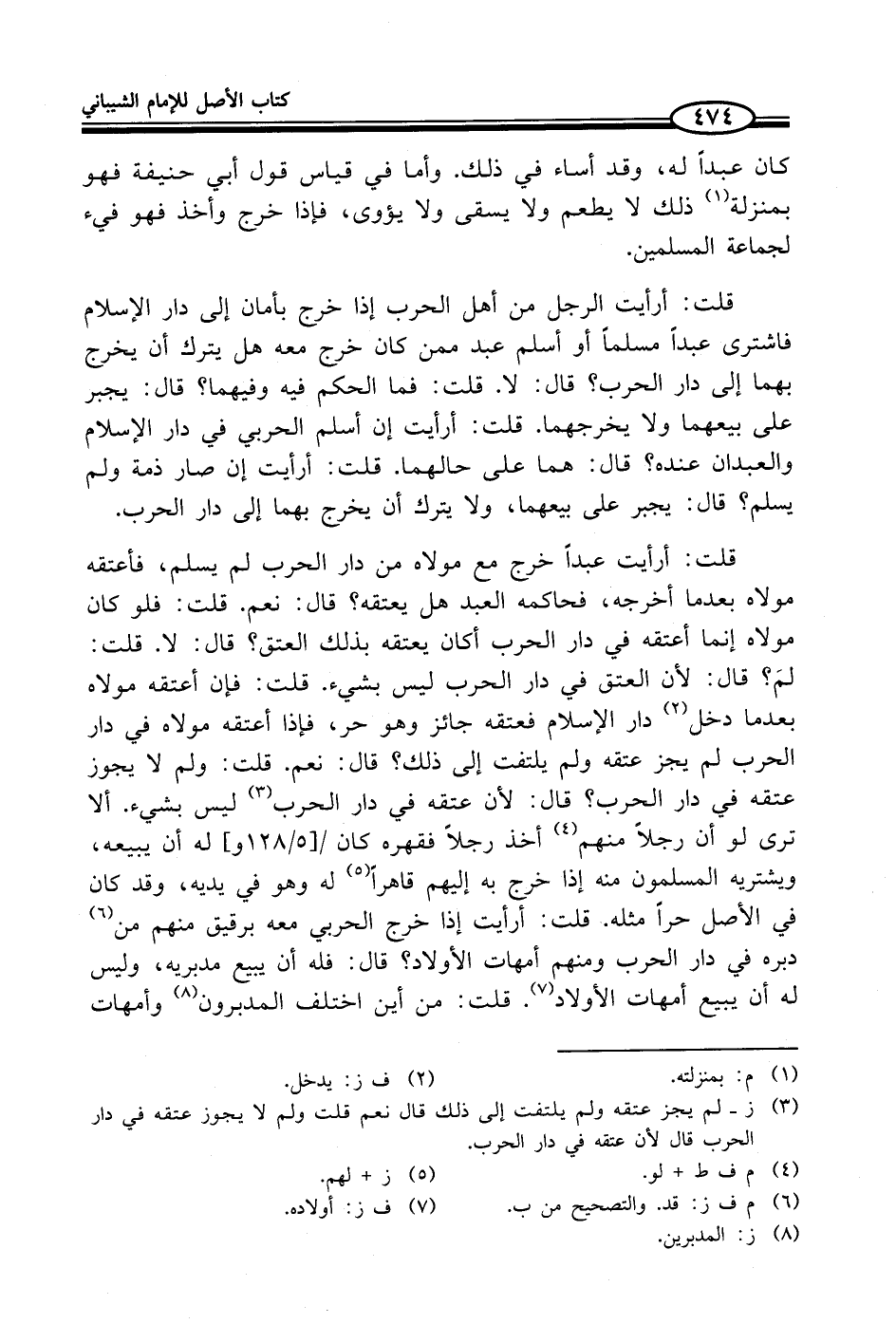 قلت: أرأيت الرجل من أهل الحرب إذا خرج بأمان إلى دار الإسلام فاشترى عبداً مسلماً أو أسلم عبد ممن كان خرج معه هل يترك أن يخرج بهما إلى فى دار الحرب؟ قال: لا. قلت: فما الحكم فيه وفيهما؟ قال: يجبر على بيعهما ولا يخرجهما. قلت: أرأيت إن أسلم الحربي في دار الإسلام والعبدان عنده؟ قال: هما على حالهما. قلت: أرأيت إن صار ذمة ولم يسلم؟ قال: يجبر على بيعهما، ولا يترك أن يخرج بهما إلى دار الحرب.