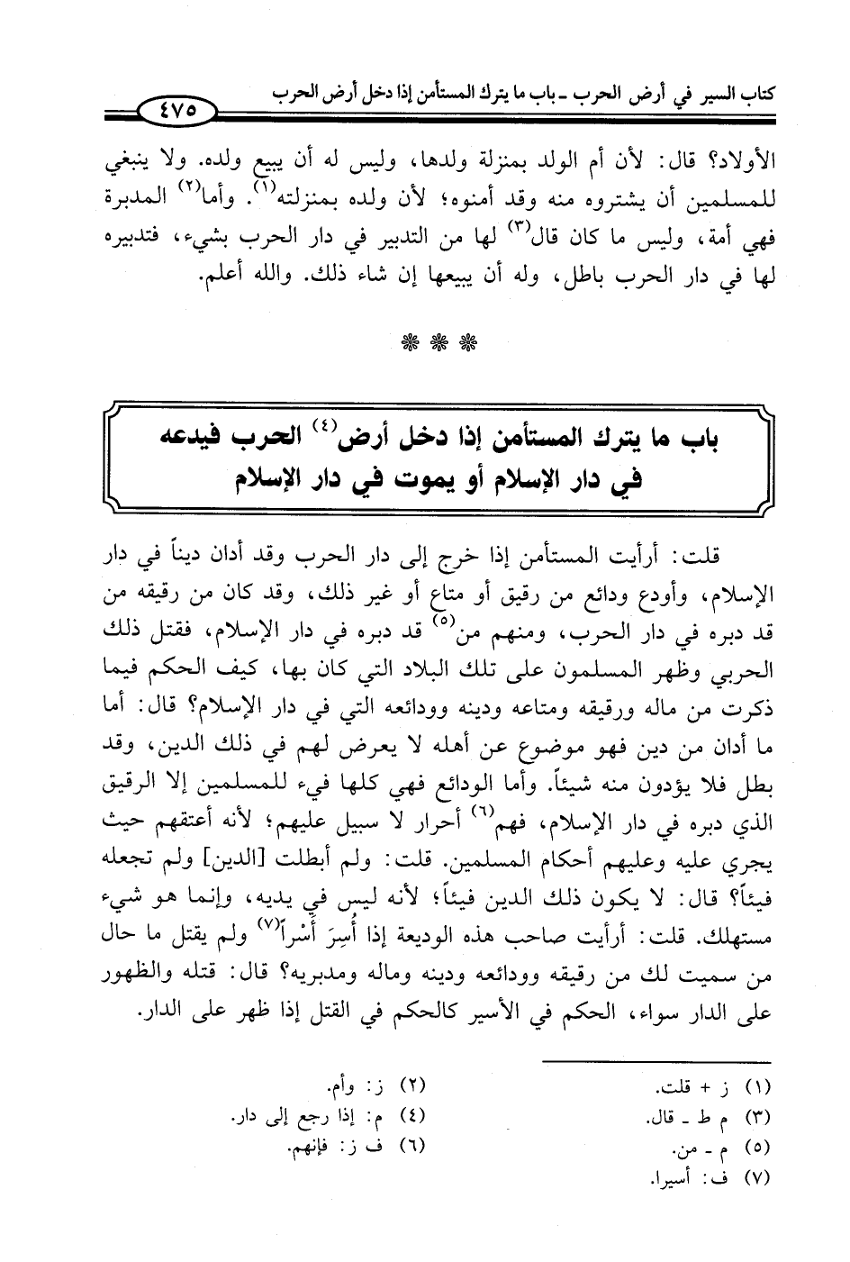 قلت: أرأيت المستأمن إذا خرج إلى دار الحرب وقد أدان ديناً في دار الإسلام، وأوح ودائع من رقيق أو متاع أو غير ذلك، وقد كان من رقيقه من قد دبره في دار الحرب، ومنهم من (¬5) قد دبره في دار الإسلام، فقتل ذلك الحربي وظهر المسلمون على تلك البلاد التي كان بها، كيف الحكم فيما ذكرت من ماله ورقيقه ومتاعه ودينه وودائعه التي في دار الإسلام؟ قال: أما ما أدان من دين فهو موضوع عن أهله لا يعرض لهم في ذلك الدين، وقد بطل فلا يؤدون منه شيئاً. وأما الودائع فهي كلها فيء للمسلمين إلا الرقيق الذي دبره في دار الإسلام، فهم (¬6) أحرار لا سبيل عليهم؛ لأنه أعتقهم حيث يجري عليه وعليهم أحكام المسلمين. قلت: ولم أبطلت [الدين] ولم تجعله فيئاً؟ قال: لا يكون ذلك الدين فيئاً؛ لأنه ليس في يديه، وإنما هو شيء مستهلك. قلت: أرأيت صاحب هذه الوديعة إذا أُسِرَ أَسْراً (¬7) ولم يقتل ما حال من سميت لك من رقيقه وودائعه ودينه وماله ومدبريه؟ قال: قتله والظهور على الدار سواء، الحكم في الأسير كالحكم في القتل إذا ظهر على الدار.