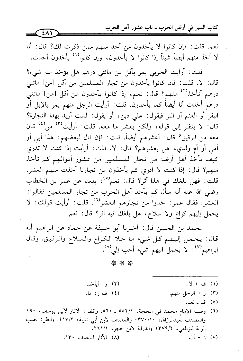 قلت: أرأيت الحربي يمر بأقل من مائتي درهم هل يؤخذ منه شيء؟ قال: لا. قلت: فإن كانوا يأخذون من تجار المسلمين من أقل [من] مائتي درهم أتأخذ (¬2) منهم؟ قال: نعم، إذا كانوا يأخذون من أقل [من] مائتي درهم أخذت أنا أيضاً كما يأخذون. قلت: أرأيت الرجل منهم يمر بالإبل أو البقر أو الغنم أو البز فيقول: علي دين، أو يقول: لست أريد بهذا التجارة؟ قال: لا ينظر إلى قوله، ولكن يعشر ما معه. قلت: أرأيت (¬3) من (¬4) كان معه من الرقيق؟ قال: أعشرهم أيضاً. قلت: فإن قال لبعضهم: هذا أبي أو أمي أو أم ولدي، هل يعشرهم؟ قال: لا. قلت: أرأيت إذا كنت لا تدري كيف يأخذ أهل أرضه من تجار المسلمين من عشور أموالهم كم تأخذ منهم؟ قال: إذا كنت لا أدري كم يأخذون من تجارنا أخذت منهم العشر. قلت: فهل بلغك في هذا أثر؟ قال: نعم (¬5)، بلغنا عن عمر بن الخطاب - رضي الله عنه - أنه سأل كم يأخذ أهل الحرب من تجار المسلمين فقالوا: العشر. فقال عمر: خذوا من تجارهم العشر (¬6). قلت: أرأيت قولك: لا يحمل إليهم كراع ولا سلاح، هل بلغك فيه أثر؟ قال: نعم.