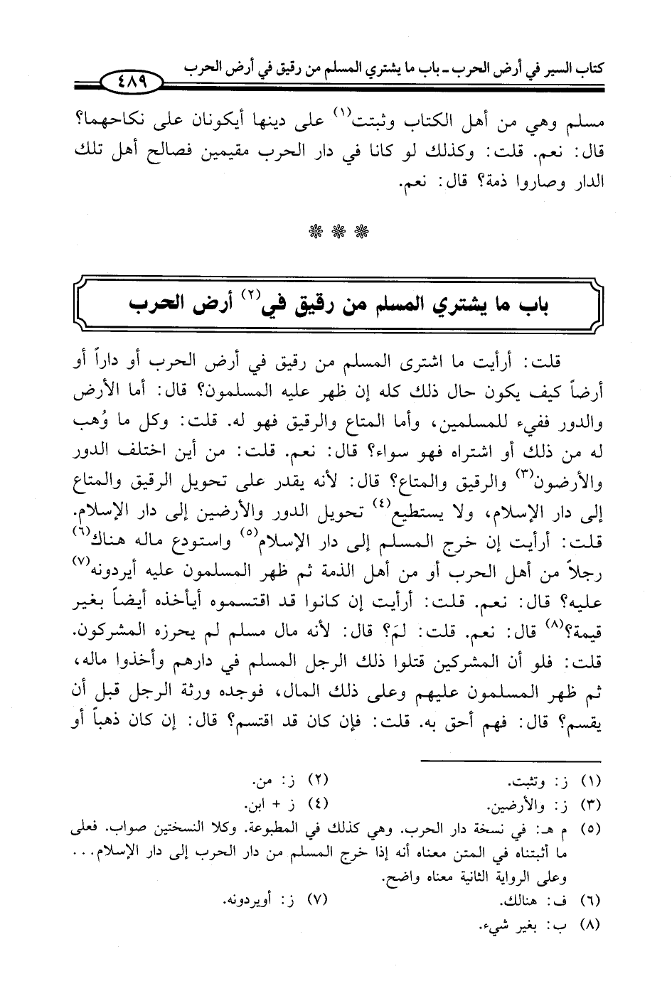 قلت: أرأيت ما اشترى المسلم من رقيق في أرض الحرب أو داراً أو أرضاً كيف يكون حال ذلك كله إن ظهر عليه المسلمون؟ قال: أما الأرض والدور ففيء للمسلمين، وأما المتاع والرقيق فهو له. قلت: وكل ما وُهب له من ذلك أو اشتراه فهو سواء؟ قال: نعم. قلت: من أين اختلف الدور والأرضون (¬3) والرقيق والمتاع؟ قال: لأنه يقدر على تحويل الرقيق والمتاع إلى دار الإسلام، ولا يستطيع (¬4) تحويل الدور والأرضين إلى دار الإسلام. قلت: أرأيت إن خرج المسلم إلى دار الإسلام (¬5) واستودع ماله هناك (¬6) رجلاً من أهل الحرب أو من أهل الذمة ثم ظهر المسلمون عليه أيردونه (¬7) عليه؟ قال: نعم. قلت: أرأيت إن كانوا قد اقتسموه أيأخذه أيضاً بغير قيمة؟ (¬8) قال: نعم. قلت: لمَ؟ قال: لأنه مال مسلم لم يحرزه المشركون. قلت: فلو أن المشركين قتلوا ذلك الرجل المسلم في دارهم وأخذوا ماله، ثم ظهر المسلمون عليهم وعلى ذلك المال، فوجده ورثة الرجل قبل أن يقسم؟ قال: فهم أحق به. قلت: فإن كان قد اقتسم؟ قال: إن كان ذهباً أو